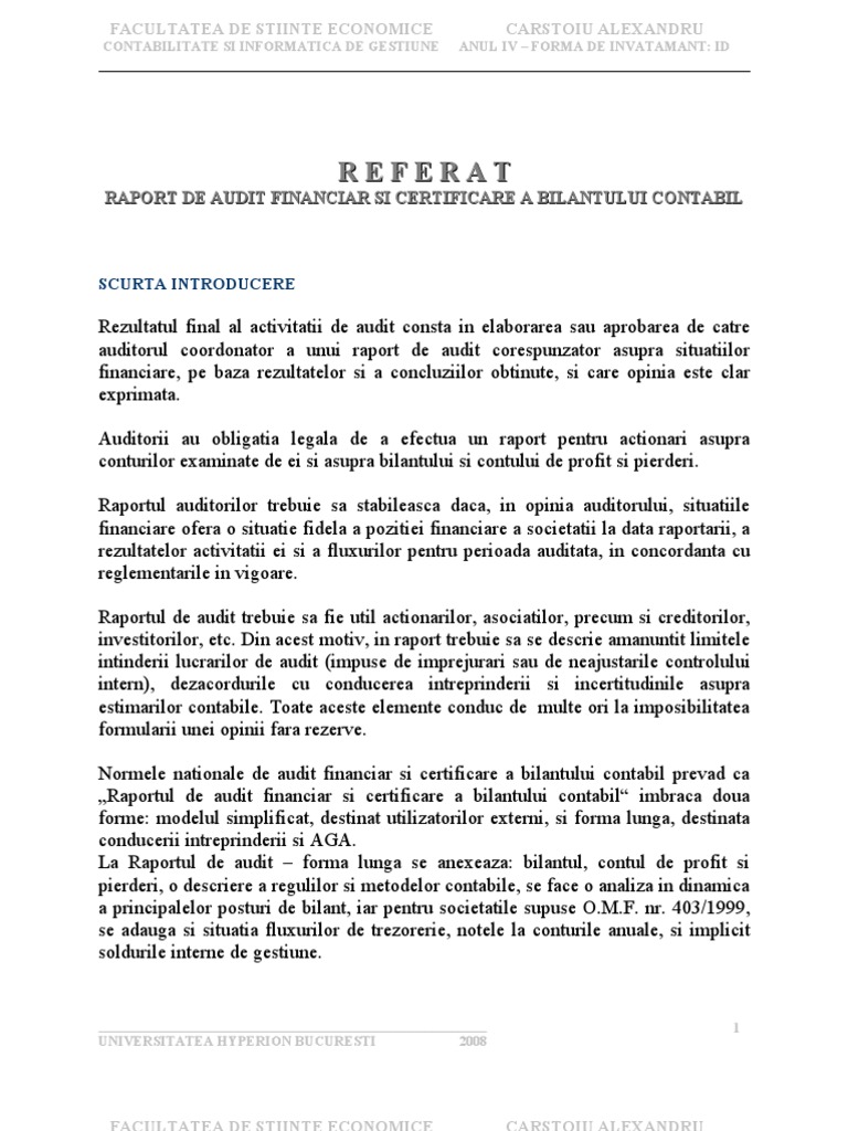 In executarea misiunii incredintate, va prezentam Raportul de audit financiar si certificare a bilantului contabil al S.C. REFERAT NOTA 10 S.R.L. Bucuresti str. Universitatii nr. 10, privind exercitiul incheiat la data de 31 decembrie 2001 astfel cum sunt prezentate in anexele la prezentul raport (A.B.C. si D.). Am procedat la auditarea conform normelor legale a bilantului S.C. REFERAT NOTA 10 S.R.L. Bucuresti incheiat la data de 31 decembrie 2001, a contului de profit si pierdere, si a anexelor pentru exercitiul incheiat la aceasta data, asa cum sunt prezentate in anexele la prezentul raport. Aceste conturi anuale au fost stabilite sub responsabilitatea conducerii unitatii. Noi am efectuat auditul conform Normelor de audit financiar si certificare a bilantului contabil elaborate de Corpul Expertilor Contabili si Contabililor Autorizati din Romnia, norme aliniate la standardele europene si internationale in domeniu. Dupa parerea noastra, conturile anuale dau o imagine fidela situatiei financiare a unitatii la 31 decembrie 2001, ct si a contului de profit si pierdere si fluxului de trezorerie pentru exercitiul incheiat la aceasta data, in conformitate cu normele de audit financiar si certificare a bilantului contabil, elaborate de Corpul Expertilor Contabili si Contabililor Autorizati din Romnia, si cu prevederile Legii nr 82/1991 legea contabilitatii, si a Ordonantei Guvernului nr.22/1996 cu privire la actualizarea si completarea regimului general al contabilitatii. Bucuresti la 29.01.2002