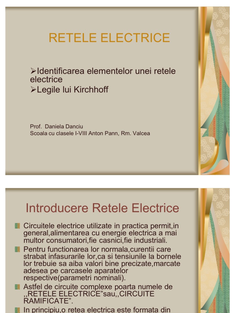 Circuitele electrice utilizate in practica permit,in general,alimentarea cu energie electrica a mai multor consumatori,fie casnici,fie industriali. Pentru functionarea lor normala,curentii care strabat infasurarile lor,ca si tensiunile la bornele lor trebuie sa aiba valori bine precizate,marcate adesea pe carcasele aparatelor respective(parametri nominali). Astfel de circuite complexe poarta numele de ,,RETELE ELECTRICEsau,,CIRCUITE RAMIFICATE. In principiu,o retea electrica este formata din mai multe generatoare si consumatoare.