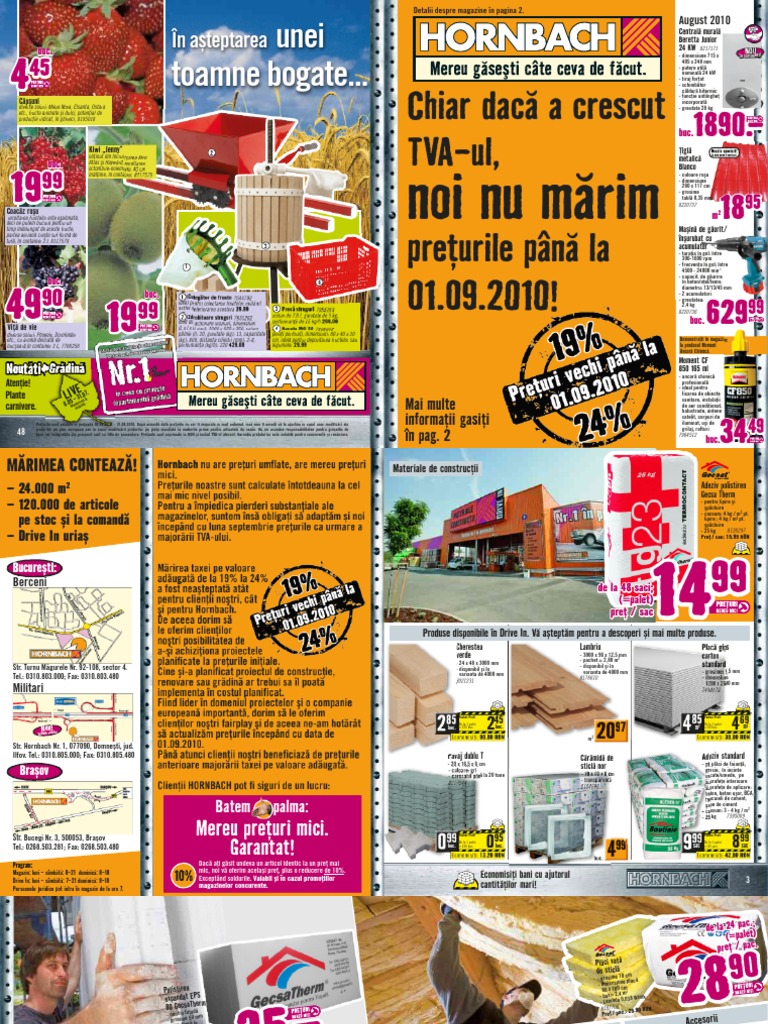 Hornbach nu are preuri umflate, are mereu preuri mici. Preurile noastre sunt calculate ntotdeauna la cel mai mic nivel posibil. Pentru a mpiedica pierderi substaniale ale magazinelor, suntem ns obligai s adaptm i noi ncepnd cu luna septembrie preurile ca urmare a majorrii TVA-ului. Mrirea taxei pe valoare adugat de la 19% la 24% a fost neateptat att pentru clienii notri, ct i pentru Hornbach. De aceea dorim s le oferim clienilor notri posibilitatea de a-i achiziiona proiectele planificate la preurile iniiale. Cine i-a planificat proiectul de construcie, renovare sau grdin ar trebui sa l poat implementa n costul planificat. Fiind lider n domeniul proiectelor i o companie european important, dorim s le oferim clienilor notri fairplay i de aceea ne-am hotrt s actualizm preurile ncepnd cu data de 01.09.2010. Pn atunci clienii notri beneficiaz de preurile anterioare majorrii taxei pe valoare adugat. Clienii HORNBACH pot fi siguri de un lucru:
