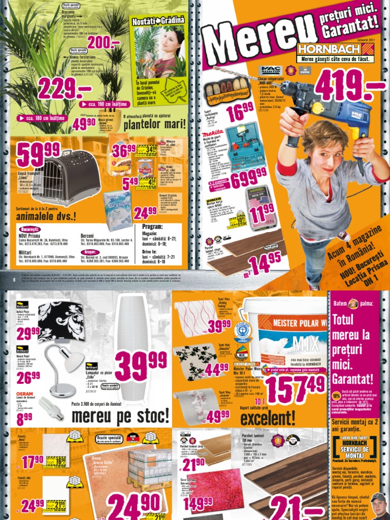 Preurile sunt valabile n perioada 03.01.2011 - 31.01.2011. Dup aceast dat preurile nu vor fi majorate n mod automat, ns vom fi nevoii s le ajustm n cazul unor modificri ale preurilor pe plan european sau n cazul modificrii preurilor pe piaa mondial la materiile prime pentru articolele de sezon. Nu ne asumm responsabilitatea pentru greelile de tipar, iar fotografiile din prospect sunt cu titlu de prezentare. Preurile sunt exprimate n RON i includ TVA-ul aferent. Garania preului nu este valabil pentru concuren i revnzare.