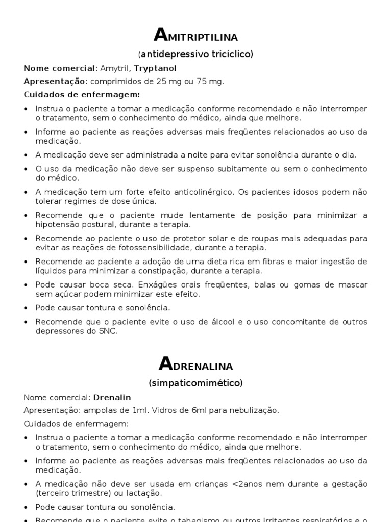 (antidepressivo tricclico) Nome comercial: Amytril, Tryptanol Apresentao: comprimidos de 25 mg ou 75 mg. Cuidados de enfermagem: Instrua o paciente a tomar a medicao conforme recomendado e no interromper o tratamento, sem o conhecimento do mdico, ainda que melhore. Informe ao paciente as reaes adversas mais freqentes relacionados ao uso da medicao. A medicao deve ser administrada a noite para evitar sonolncia durante o dia. O uso da medicao no deve ser suspenso subitamente ou sem o conhecimento do mdico. A medicao tem um forte efeito anticolinrgico. Os pacientes idosos podem no tolerar regimes de dose nica. Recomende que o paciente mude lentamente de posio para minimizar a hipotenso postural, durante a terapia. Recomende ao paciente o uso de protetor solar e de roupas mais adequadas para evitar as reaes de fotossensibilidade, durante a terapia. Recomende ao paciente a adoo de uma dieta rica em fibras e maior ingesto de lquidos para minimizar a constipao, durante a terapia. Pode causar boca seca. Enxges orais freqentes, balas ou gomas de mascar sem acar podem minimizar este efeito. Pode causar tontura e sonolncia. Recomende que o paciente evite o uso de lcool e o uso concomitante de outros depressores do SNC.