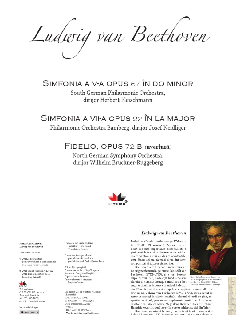 Descrierea CIP a Bibliotecii Naionale a Romniei MARI COMPOZITORI / trad.: Graal Soft. Bucureti : Litera Internaional, 2011 40 vol. ISBN 978-606-600-027-7 Vol. 1.: Ludwing van Beethoven. 2011. ISBN 978-606-600-028-4 78