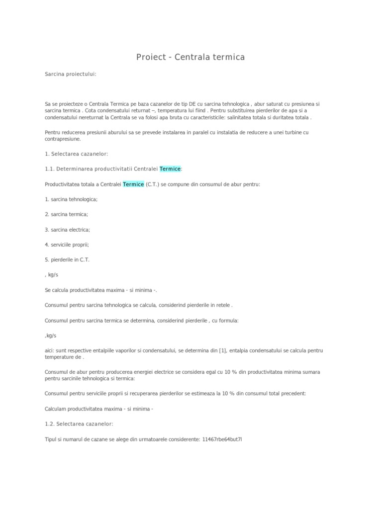 Sa se proiecteze o Centrala Termica pe baza cazanelor de tip DE cu sarcina tehnologica , abur saturat cu presiunea si sarcina termica . Cota condensatului returnat , temperatura lui fiind . Pentru substituirea pierderilor de apa si a condensatului nereturnat la Centrala se va folosi apa bruta cu caracteristicile: salinitatea totala si duritatea totala . Pentru reducerea presiunii aburului sa se prevede instalarea in paralel cu instalatia de reducere a unei turbine cu contrapresiune. 1. Selectarea cazanelor: 1.1. Determinarea productivitatii Centralei Termice: Productivitatea totala a Centralei Termice (C.T.) se compune din consumul de abur pentru: 1. sarcina tehnologica; 2. sarcina termica; 3. sarcina electrica; 4. serviciile proprii; 5. pierderile in C.T. , kg/s Se calcula productivitatea maxima - si minima -. Consumul pentru sarcina tehnologica se calcula, considerind pierderile in retele . Consumul pentru sarcina termica se determina, considerind pierderile , cu formula: ,kg/s aici: sunt respective entalpiile vaporilor si condensatului, se determina din [1], entalpia condensatului se calcula pentru temperature de . Consumul de abur pentru producerea energiei electrice se considera egal cu 10 % din productivitatea minima sumara pentru sarcinile tehnologica si termica: Consumul pentru serviciile proprii si recuperarea pierderilor se estimeaza la 10 % din consumul total precedent: Calculam productivitatea maxima - si minima 1.2. Selectarea cazanelor: Tipul si numarul de cazane se alege din urmatoarele considerente: 11467rbe64but7l