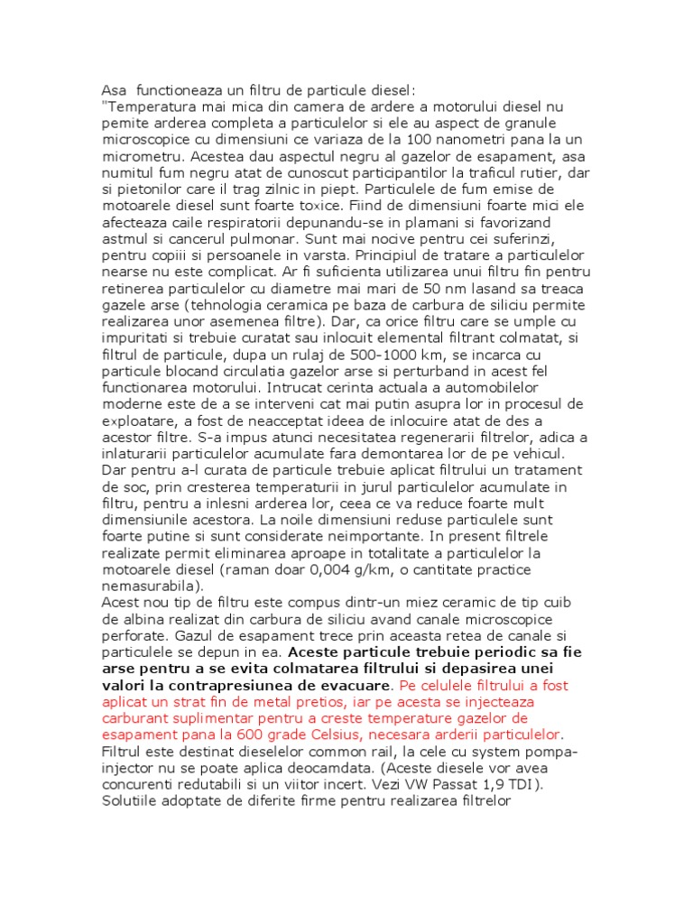 completa a particulelor si ele au aspect de granule microscopice cu dimensiuni ce variaza de la 100 nanometri pana la un micrometru. Acestea dau aspectul negru al gazelor de esapament, asa numitul fum negru atat de cunoscut participantilor la traficul rutier, dar si pietonilor care il trag zilnic in piept. Particulele de fum emise de motoarele diesel sunt foarte toxice. Fiind de dimensiuni foarte mici ele afecteaza caile respiratorii depunandu-se in plamani si favorizand astmul si cancerul pulmonar. Sunt mai nocive pentru cei suferinzi, pentru copiii si persoanele in varsta. Principiul de tratare a particulelor nearse nu este complicat. Ar fi suficienta utilizarea unui filtru fin pentru retinerea particulelor cu diametre mai mari de 50 nm lasand sa treaca gazele arse (tehnologia ceramica pe baza de carbura de siliciu permite realizarea unor asemenea filtre). Dar, ca orice filtru care se umple cu impuritati si trebuie curatat sau inlocuit elemental filtrant colmatat, si filtrul de particule, dupa un rulaj de 500-1000 km, se incarca cu particule blocand circulatia gazelor arse si perturband in acest fel functionarea motorului. Intrucat cerinta actuala a automobilelor moderne este de a se interveni cat mai putin asupra lor in procesul de exploatare, a fost de neacceptat ideea de inlocuire atat de des a acestor filtre. S-a impus atunci necesitatea regenerarii filtrelor, adica a inlaturarii particulelor acumulate fara demontarea lor de pe vehicul. Dar pentru a-l curata de particule trebuie aplicat filtrului un tratament de soc, prin cresterea temperaturii in jurul particulelor acumulate in filtru, pentru a inlesni arderea lor, ceea ce va reduce foarte mult dimensiunile acestora. La noile dimensiuni reduse particulele sunt foarte putine si sunt considerate neimportante. In present filtrele realizate permit eliminarea aproape in totalitate a particulelor la motoarele diesel (raman doar 0,004 g/km, o cantitate practice nemasurabila). Acest nou tip de filtru este compus dintr-un miez ceramic de tip cuib de albina realizat din carbura de siliciu avand canale microscopice perforate. Gazul de esapament trece prin aceasta retea de canale si particulele se depun in ea. Aceste particule trebuie periodic sa fie arse pentru a se evita colmatarea filtrului si depasirea unei valori la contrapresiunea de evacuare. Pe celulele filtrului a fost aplicat un strat fin de metal pretios, iar pe acesta se injecteaza carburant suplimentar pentru a creste temperature gazelor de esapament pana la 600 grade Celsius, necesara arderii particulelor. Filtrul este destinat dieselelor common rail, la cele cu system pompainjector nu se poate aplica deocamdata. (Aceste diesele vor avea concurenti redutabili si un viitor incert. Vezi VW Passat 1,9 TDI). Solutiile adoptate de diferite firme pentru realizarea filtrelor