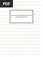se spala singur cand face baie cu exceptia gatului si a spatelui. 71. Foloseste cutitul pentru a unge unt sau gem pe paine, inchide si deschide catarama la haine. 72. Se imbraca singur complet, se serveste la masa din castron cu polonic ( castronul tinut de adult). 73. Ajuta la pusul mesei folosind corect farfuriile, [Link] spala pe dinti, merge la toaleta la vreme, se dezbraca, se sterge si se imbraca fara ajutor. 74. Se piaptana sau se perie daca are parul lung. 75. Poate merge in vecinatatea casei fara sa fie supravegheat permanent. 76. Insira sireturile la pantofi si ii leaga. 5-6 ani 77. Este responsabil pentru o sarcina gospodareasca, una pe saptamana si o indeplineste la cerere. 78. Isi alege imbracamintea potrivita in functie de timp si ocazie. 79. Se opreste la colt, se uita in ambele parti si traverseaza strada fara indicatii verbale. 80. Se serveste la masa si da mai departe platoul. 81. Isi prepara singur mancarea simpla (Fulgi de ovaz cu lapte, etc). 82. Este responsabil pentru sarcina gospodareasca zilnica (dusul gunoiului din casa sau alta sarcina). 83. Isi poate potrivi temperatura apei pentru baie sau dus si isi poate pregati singur o tartina. 84. Merge la scoala, gradinita sau magazin la distanta de cel mult 2 strazi. 85. Incearca sa taie alimente mari cu cutitul (banane, cartofi fierti), gaseste toaleta potrivita cu sexul in locuri publice. 86. Deschide o sticla cu lapte. 87. Poate lua, duce si aseza cu putin ajutor tava, in cantina cu autoservire. 88. Isi poate incheia sireturile la gluga si-si poate incheia centura de siguranta la masina.