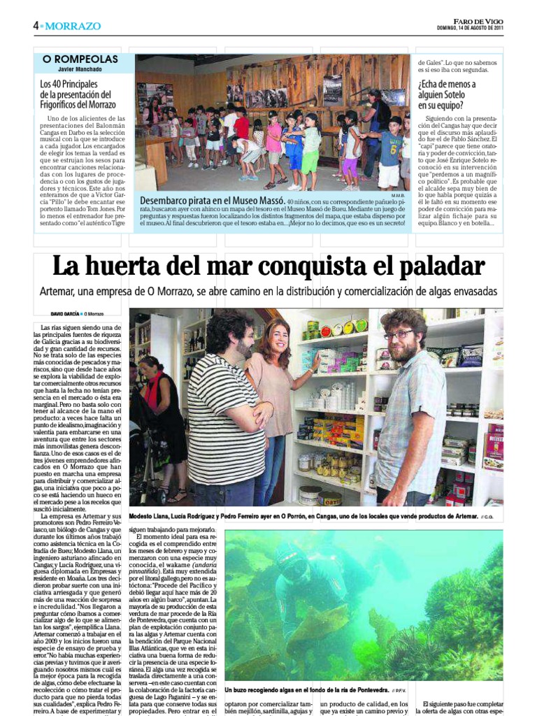 Las ras siguen siendo una de las principales fuentes de riqueza de Galicia gracias a su biodiversidad y gran cantidad de recursos. No se trata solo de las especies ms conocidas de pescados y mariscos, sino que desde hace aos se explora la viabilidad de explotar comercialmente otros recursos que hasta la fecha no tenan presencia en el mercado o sta era marginal. Pero no basta solo con tener al alcance de la mano el producto: a veces hace falta un punto de idealismo,imaginacin y valenta para embarcarse en una aventura que entre los sectores ms inmovilistas genera desconfianza. Uno de esos casos es el de tres jvenes emprendedores afincados en O Morrazo que han puesto en marcha una empresa para distribuir y comercializar algas, una iniciativa que poco a poco se est haciendo un hueco en el mercado pese a los recelos que suscit inicialmente. La empresa es Artemar y sus promotores son Pedro Ferreiro Velasco, un bilogo de Cangas y que durante los ltimos aos trabaj como asistencia tcnica en la Cofrada de Bueu; Modesto Llana, un ingeniero asturiano afincado en Cangas; y Luca Rodrguez, una viguesa diplomada en Empresas y residente en Moaa. Los tres decidieron probar suerte con una iniciativa arriesgada y que gener ms de una reaccin de sorpresa e incredulidad.Nos llegaron a preguntar cmo bamos a comercializar algo de lo que se alimentan los sargos, ejemplifica Llana. Artemar comenz a trabajar en el ao 2009 y los inicios fueron una especie de ensayo de prueba y error.No haba muchas experiencias previas y tuvimos que ir averiguando nosotros mismos cul es la mejor poca para la recogida de algas, cmo debe efectuarse la recoleccin o cmo tratar el producto para que no pierda todas sus cualidades, explica Pedro Ferreiro. A base de experimentar y cometer algunos errores dieron con el proceso adecuado, aunque