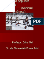 oraelor, lsndu-ne materiale dintre cele mai interesante i valoroase. n evaluarea rolului localitilor urbane romneti ca purttoare de folclor, lum n consideraie att naterea lor relativ trzie, ct i contextul diferit n care s-au format i s-au dezvoltat pe o anumit perioad. Dac Muntenia i Moldova a cunoscut aezri urbane de tip sud-european cu iz bizantin, apoi cu influene ale neamurilor balcanice, n Transilvania unele orae s-au constituit pe modelul burgurilor occidentale. Un folclor inedit a nflorit prin contactul dintre tradiia rneasc i oriental, pe cnd n Transilvania i Banat, treptat, din vechi sate i trguri, s-au creat orae cu populaie majoritar romneasc Beiu, Blaj, Lugoj, Caransebe unde cultura tradiional s-a meninut viguroas pn n zilele noastre. Trebuie s recunoatem, totui, c n ultimul timp, prin aglomerarea forat a multor orae, viaa de tip citadin a diminuat considerabil ceea ce obinuim s spunem folclor, zonele s-au ntreptruns uneori pn la uniformizare, favoriznd kitsch-ul (frumosul inadecvat, deplasat) i exacerbndu-se funcia distractiv, pn la alterarea gustului estetic. Atitudinea variat fa de tradiie nu se remarc numai la nivelul grupurilor sociale, ci i pe categorii de vrst i sex: odat cu trecerea anilor, oamenii devin mai conservatori, cenzurnd i produciile tinerilor, de obicei mai nclinai spre nnoiri; fa de brbai, obligai deseori s ias din mediul respectiv, prin armat, rzboi, pstorit sau alte ocupaii i pui n situaia de a recepta i alte creaii, femeile rmneau mai legate de vatr, deci mai fidele datinilor locului. Caracterul etnic-tradiional condiioneaz i anumita funcionalitate a folclorului. Creaia savant apare din necesiti predominant estetice i reprezint apanajul unui individ, ce acioneaz, chiar dac l ntruchipeaz, independent de context. n mare parte, faptele de folclor se produc ntr-un anume timp i ntr-un anume loc, avnd un rost precis n existena comunitii sau marcnd un eveniment ndtinat. Lazrul, Paparuda, cntecul Cununii, dansul Cluarilor, colindul, cntecul miresei, cntecul zorilor, semnalele pstoreti au o funcie exact, sunt legate de un prilej. Funcia poate fi, dup cum vom vedea, utilitar, ritual, ceremonial, estetic, spectacular i determin adaptarea anumitor configuraii poeticomuzicale sau coregrafice; dup gradul i caracterul funciei, se vor clasifica i categoriile folclorice n: ocazionale i neocazionale. Aceast nsuire a creaiei populare a opus, n opinia unor teoreticieni (23, 59) un frumos folcloric, mai mult de natur