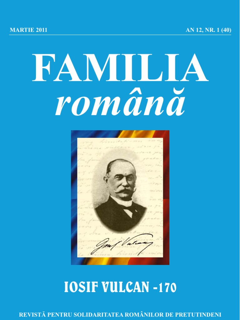 MARTIE 2011 7/19, respectiv 9/21 ianuarie, articolul O scriere critic, n care ia aprarea fostului su profesor mpotriva atacurilor lansate de Dimitrie Petrino n broura Puine cuvinte despre coruperea limbii romne n Bucovina, tiprit la Cernui n 1869. Fostul i devotatul elev subliniaz esenialul, artnd c meritul profesorului cernuean st n faptul c d consisten i contiin naional maselor i face din ele o naiune.1 Asupra valorii creaiei literare a lui Iosif Vulcan exist o unanimitate de preri, care o exclud din circuitul lecturilor obligatorii, izolnd-o n trecut. Dei, n privina revistei Familia, aprecierile sunt mai nuanate, acestea sunt departe de a reconstitui tabloul complet al influenei i realizrilor revistei, posibil consecin a unui efect de halou.2 Prins ntre debutul ce s-a constituit n botezul literar al lui Mihai Eminescu i activismul naional viril al gazetelor transilvnene din epoc, revistei Familia i se scap din vedere principalele merite. Iar cheia trebuie cutat n acel: Voiesc s dau n mna publicului o foaie cu care dnsul s se poat fli. Pornind de la calitatea hrtiei, a ilustraiilor, de la format i diversitatea coninutului, revista Familia este la nivelul revistelor similare ungureti ale vremii care circulau n Imperiu, cu care publicul romnesc cititor de gazete era familiarizat. Dac revistele militante erau adresate celor cu o contiin naional mai clar conturat, revista Familia reuete s ptrund i s cucereasc cercurile largi ale romnilor aparinnd unei pturi de mijloc, buni ceteni, dornici s se cultive n mod agreabil, fiind, n acelai timp, i cei mai expui tendinelor de deznaionalizare, pentru c frecventaser, inevitabil, coli maghiare, se micau ntr-un mediu maghiarizant, iar asimilarea era o consecin aproape fireasc a dorinei de accede la poziii sociale mai bune. Aici intervine revista lui Iosif Vulcan, cu stilul ei plcut, cu lecturile uoare, promovnd o limb romn din ce n ce mai frumoas, punnd fa n fa personaliti romne din toate provinciile istorice i personaliti strine, buci literare traduse i originale, semnate de autori romni de pretutindeni, folclor din toate zonele i nescpnd niciun prilej de a atinge subtil problema unitii de limb i cultur, de a informa n legtur cu principalele evenimente din toate prile locuite de romni, de a cultiva, cu finee, un sentiment de mndrie