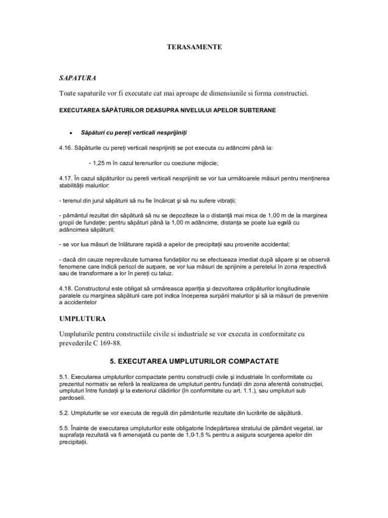 4.16. S p turile cu pere i verticali nesprijini i se pot executa cu adncimi pn la: - 1,25 m n cazul terenurilor cu coeziune mijlocie; 4.17. n cazul s p turilor cu pereti verticali nesprijiniti se vor lua urm toarele m suri pentru men inerea stabilit ii malurilor: - terenul din jurul s p turii s nu fie nc rcat i s nu sufere vibra ii; - p mntul rezultat din s p tur s nu se depoziteze la o distan mai mica de 1,00 m de la marginea gropii de funda ie; pentru s p turi pn la 1,00 m adncime, distan a se poate lua egal cu adncimea s p turii; - se vor lua m suri de nl turare rapid a apelor de precipita ii sau provenite accidental; - dac din cauze neprev zute turnarea funda iilor nu se efectueaza imediat dup s pare i se observ fenomene care indic pericol de surpare, se vor lua m suri de sprijinire a peretelui n zona respectiv sau de transformare a lor n pere i cu taluz. 4.18. Constructorul este obligat s urm reasca apari ia i dezvoltarea cr p turilor longitudinale paralele cu marginea s p turii care pot indica nceperea surp rii malurilor i s ia m suri de prevenire a accidentelor