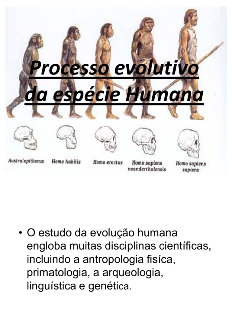 O estudo da evoluo humana engloba muitas disciplinas cientficas, incluindo a antropologia fisca, primatologia, a arqueologia, lingustica e gentica.