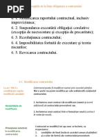 1. Principiul fortei obligatorii pacta sunt servanda este inclus in art. 969 [Link]. si presupune ca orice conventie legal facuta are putere de lege intre partile contractante forta obligatorie inseamna inca un aspect, respectiv imprejurarea ca si instanta de judecata este tinuta sa respecte intocmai contractul incheiat de parti acest principiu cunoaste cateva exceptii in virtutea carora contractul are efecte mai restrase sau dimpotriva mai extinse decat au prevazut partile initial exemplu: sunt situatii de restrangere a efectelor atunci cand mandatul este revocat expres de catre mandant, atunci cand mandatul inceteaza prin moartea mandatarului si nu continua cu mostenitorii acestuia, cand contractul de inchiriere a locuintei este denuntat unilateral pentru a doua situatie cand efectele se proroga, se extind, avem cazul in care contractul de locatiune este reinnoit prin tacita relocatiune in baza textului expres in C. civ. exista unele cazuri de abatere de la forta obligatorie a contractelor, independente de orice manifestare de vointa a partilor sau cel putin a uneia din parti a) in ipoteza contractului intuitu persoane, decesul acelei persoane face sa inceteze forta obligatorie a contractului, ale carui efecte nu se transmit la mostenitorii persoanei decedate (ex. incetarea efectelor imprumutului de folosinta, atunci cand imprumutul s-a facut cu luarea in considerare a persoanei comodatarului, care, ulterior, a decedat art. 1563 alin. 2 [Link].; contractul de mandat) b) un caz de modificare a fortei obligatorii a contractului independent de vointa partilor intalnim in cazul prelungirii (prorogarii) legale a unor contracte, dincolo de termenele prevazute de partile contractante c) o ipoteza de suspendare temporara a puterii obligatorii a contractului intalnim atunci cand, pe parcursul existentei unui contract cu executare succesiva, intervine un caz de forta majora, care impiedica, un anumit timp, executarea obligatiilor 2. Principiul irevocabilitatii nici un contract nu poate fi desfacut decat in mod simetric modului in care a fost incheiat aceasta simetrie este inscrisa in principiul formulat de art. 969 alin. (2) [Link]., care, referindu-se la conventii, arata ca ele se pot revoca prin consimtamantul mutual sau din cauze autorizate de lege de la acest principiu exista si unele exceptii, cand este posibila denuntarea unilaterala a contractului aceste exceptii trebuie sa fie prevazute in mod expres in lege sau contract cateva situatii de exceptie: - situatia donatiei (contractul de donatie este revocabil prin vointa uneia dintre parti in cazul donatiilor dintre parti, donatiile pentru ingratitudine) 3. Principiul relativitatii efectelor contractului civil art. 973 un contract produce efecte numai intre partile contractante puterea obligatorie, efectele obligatorii ale contractului privesc numai partile contractante