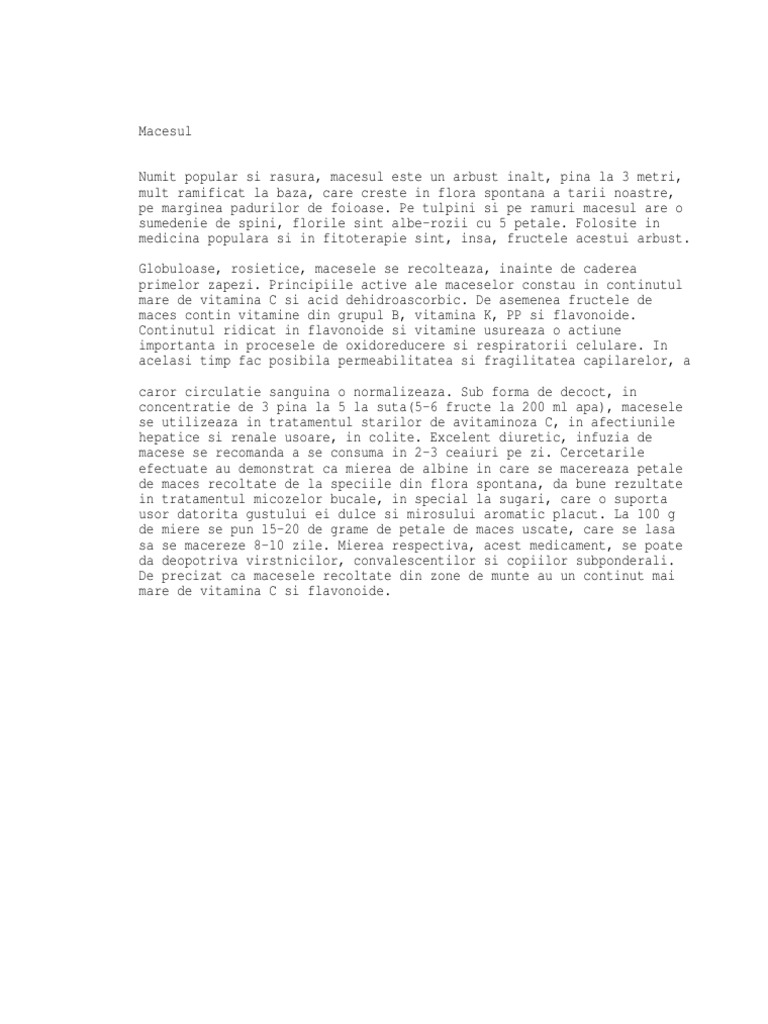 in flora spontana a tarii noastre, pe marginea padurilor de foioase. Pe tulpini si pe ramuri macesul are o sumedenie de spini, florile sint albe-rozii cu 5 petale. Folosite in medicina populara si in fitoterapie sint, insa, fructele acestui arbust. Globuloase, rosietice, macesele se recolteaza, inainte de caderea primelor zapezi. Principiile active ale maceselor constau in continutul mare de vitamina C si acid dehidroascorbic. De asemenea fructele de maces contin vitamine din grupul B, vitamina K, PP si flavonoide. Continutul ridicat in flavonoide si vitamine usureaza o actiune importanta in procesele de oxidoreducere si respiratorii celulare. In acelasi timp fac posibila permeabilitatea si fragilitatea capilarelor, a caror circulatie sanguina o normalizeaza. Sub forma de decoct, in concentratie de 3 pina la 5 la suta(5-6 fructe la 200 ml apa), macesele se utilizeaza in tratamentul starilor de avitaminoza C, in afectiunile hepatice si renale usoare, in colite. Excelent diuretic, infuzia de macese se recomanda a se consuma in 2-3 ceaiuri pe zi. Cercetarile efectuate au demonstrat ca mierea de albine in care se macereaza petale de maces recoltate de la speciile din flora spontana, da bune rezultate in tratamentul micozelor bucale, in special la sugari, care o suporta usor datorita gustului ei dulce si mirosului aromatic placut. La 100 g de miere se pun 15-20 de grame de petale de maces uscate, care se lasa sa se macereze 8-10 zile. Mierea respectiva, acest medicament, se poate da deopotriva virstnicilor, convalescentilor si copiilor subponderali. De precizat ca macesele recoltate din zone de munte au un continut mai mare de vitamina C si flavonoide.