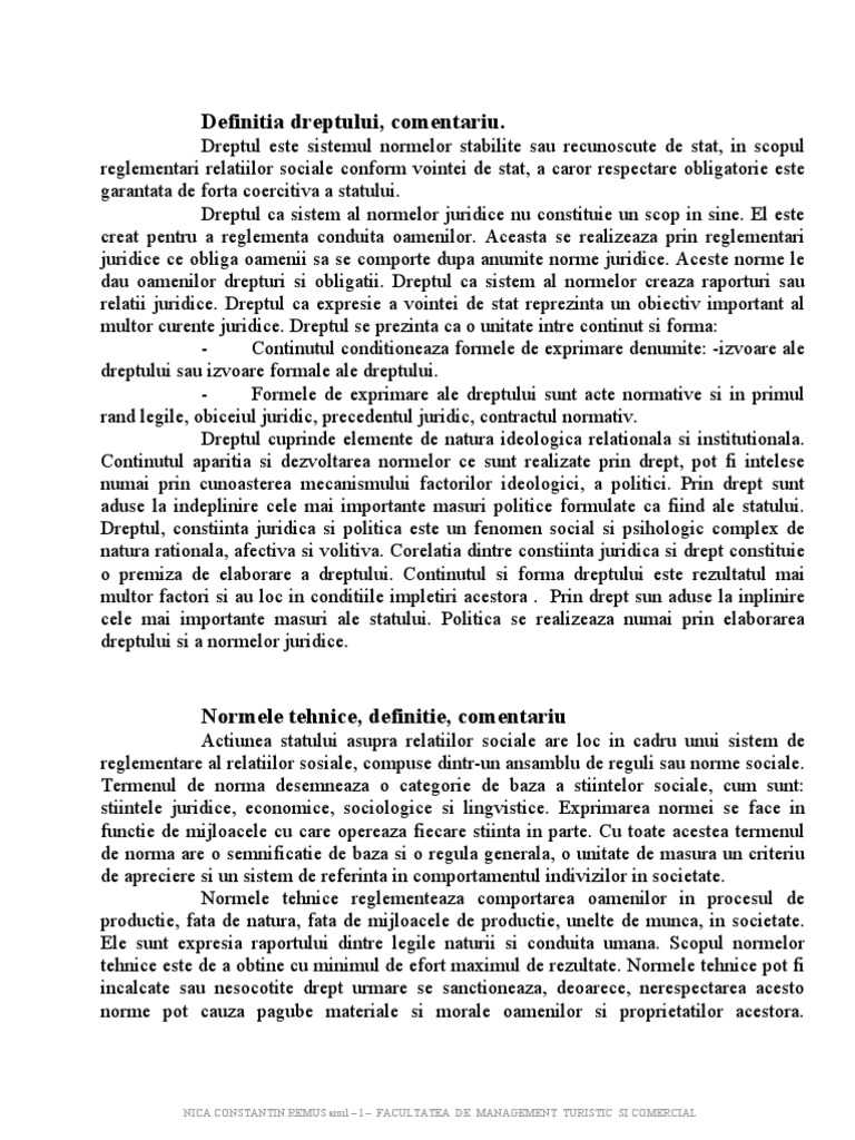 Notiunea tehnicii juridice: se intelege ansamblul normelor,al procedeelor si regulilor care imbinate cu o anumita maiestrie personala, sunt aplicate in vederea executarii unei operatii, sau lucrari in practica unei profesii oarecare. Tehnica juridica are sarcina de a gasi mijloacele optime, pentru a transpune in drept, norme juridice vointa de stat careia conducerea politica vrea sa-i dea forta juridica si sa o ridice la rang de lege. In literatura juridica s-au depus eforturi pentru a face distinctie intre stiinta juridica si tehnica juridica. Tehnica juridica a aparut odata cu dreptul si mai ales cu cel scris. Studiile despre tehnica juridica au aparut mult mai tarziu. Tehnica juridica reprezinta ansamblul sau totalitatea procedurilor si metodelor folosite intr-un sistem de drept cu scopul elaborarii actelor normative si aplicarii acestora in viata. Tehnica juridica este un concept complex, care coprinde atat tehnica elaborarii dreptului, tehnica legislativa, cat si tehnica realizarii, aplicarii si interpretarii dreptului. Tehnica elaborari dreptului Actul normativ are intotdeauna mai multe parti constructive menite sa-i dea forma finala. Aceasta regula nu este obligatorie ci se adapteaza functie de caracterul si intinderea actului normativ. Actul normativ cuprinde de regula: titlu, preambul si forma introductiva, cand este cazul dispozitii sau principii generale si dispozitii de continut, dispozitii finale, dispozitii tranzitosii. -Titlul trebuie sa fie concis si sa exprime precis obiectul reglementari. -Preambulul actului normativ reprezinta o succinta introducere unde se arata consideratiile sociale, economice politice, avute in vedre la elaborarea actului. -Forma introductiva este acea parte a actului normativ unde se arata temeiul constitutional sau juridic legal in baza caruia este data reglementarea respectiva -Reglementarea propiuzisa, in functie de volumul reglementarilor, se divide in mai multe parti; o parte este data de dispozitii sau principii generale si o parte de dispozitii de continut care pot fi mult mai numeroase si sa se imparta in subdiviziuni . -Partea finala contine, dispozitii finale propiuzise ce se refera la data intrari in vigoare . In textul legii pot exista si dispozitii tranzitorii. Acestea se unifica de obicei cu dispozitiile finale, alteori se alcatuiesc distinct. Elementele de structura ale actelor normative. Elementul structural de baza este articolul. Articolul cuprinde mai multe aliniate cand dispozitia cuprinde mai multe propozitii si contine mai multe variabile. Articolele sunt numerotate cu cifra arabe. Exista si articole unice ce nu cuprind aliniate. Modificarea actelor normative se face printr-un act normativ sau print-un act de aceeasi categorie. Cand se adauga sau se modifica un act normativ astfel incat din