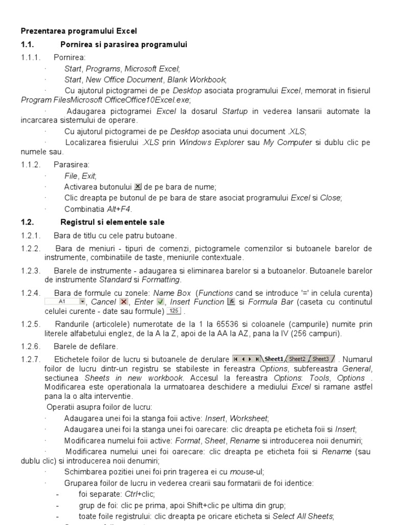 Pornirea si parasirea programului Pornirea: Start, Programs, Microsoft Excel; Start, New Office Document, Blank Workbook; Cu ajutorul pictogramei de pe Desktop asociata programului Excel, memorat in fisierul Program FilesMicrosoft OfficeOffice10Excel.exe; Adaugarea pictogramei Excel la dosarul Startup in vederea lansarii automate la incarcarea sistemului de operare. Cu ajutorul pictogramei de pe Desktop asociata unui document .XLS; Localizarea fisierului .XLS prin Windows Explorer sau My Computer si dublu clic pe numele sau. 1.1.2. 1.2. 1.2.1. 1.2.2. 1.2.3. 1.2.4. Parasirea: File, Exit; Activarea butonului de pe bara de nume; Clic dreapta pe butonul de pe bara de stare asociat programului Excel si Close; Combinatia Alt+F4. Registrul si elementele sale Bara de titlu cu cele patru butoane. Bara de meniuri - tipuri de comenzi, pictogramele comenzilor si butoanele barelor de instrumente, combinatiile de taste, meniurile contextuale. Barele de instrumente - adaugarea si eliminarea barelor si a butoanelor. Butoanele barelor de instrumente Standard si Formatting. Bara de formule cu zonele: Name Box (Functions cand se introduce '=' in celula curenta) , Cancel , Enter , Insert Function si Formula Bar (caseta cu continutul celulei curente - date sau formule) . Randurile (articolele) numerotate de la 1 la 65536 si coloanele (campurile) numite prin literele alfabetului englez, de la A la Z, apoi de la AA la AZ, pana la IV (256 campuri). Barele de defilare.