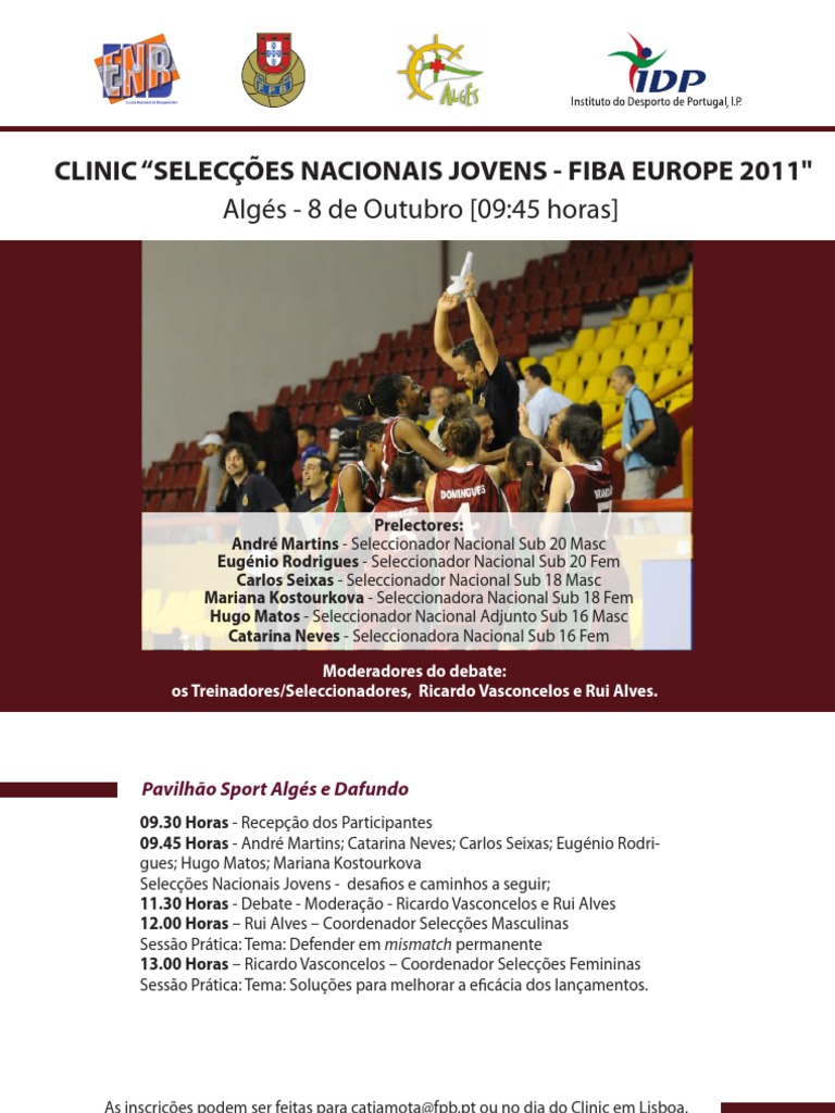 09.30 Horas - Recepo dos Participantes 09.45 Horas - Andr Martins; Catarina Neves; Carlos Seixas; Eugnio Rodrigues; Hugo Matos; Mariana Kostourkova Seleces Nacionais Jovens - desa os e caminhos a seguir; 11.30 Horas - Debate - Moderao - Ricardo Vasconcelos e Rui Alves 12.00 Horas Rui Alves Coordenador Seleces Masculinas Sesso Prtica: Tema: Defender em mismatch permanente 13.00 Horas Ricardo Vasconcelos Coordenador Seleces Femininas Sesso Prtica: Tema: Solues para melhorar a e ccia dos lanamentos.
