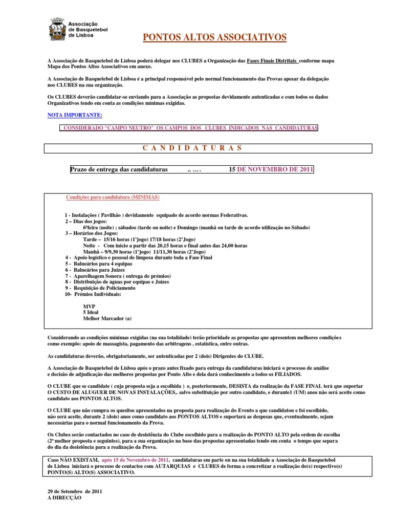 A Associao de Basquetebol de Lisboa poder delegar nos CLUBES a Organizao das Fases Finais Distritais conforme mapa Mapa dos Pontos Altos Associativos em anexo. A Associao de Basquetebol de Lisboa a principal responsvel pelo normal funcionamento das Provas apesar da delegao nos CLUBES na sua organizao. Os CLUBES devero candidatar-se enviando para a Associao as propostas devidamente autenticadas e com todos os dados Organizativos tendo em conta as condies mnimas exigidas. NOTA IMPORTANTE: CONSIDERADO CAMPO NEUTRO OS CAMPOS DOS CLUBES INDICADOS NAS CANDIDATURAS