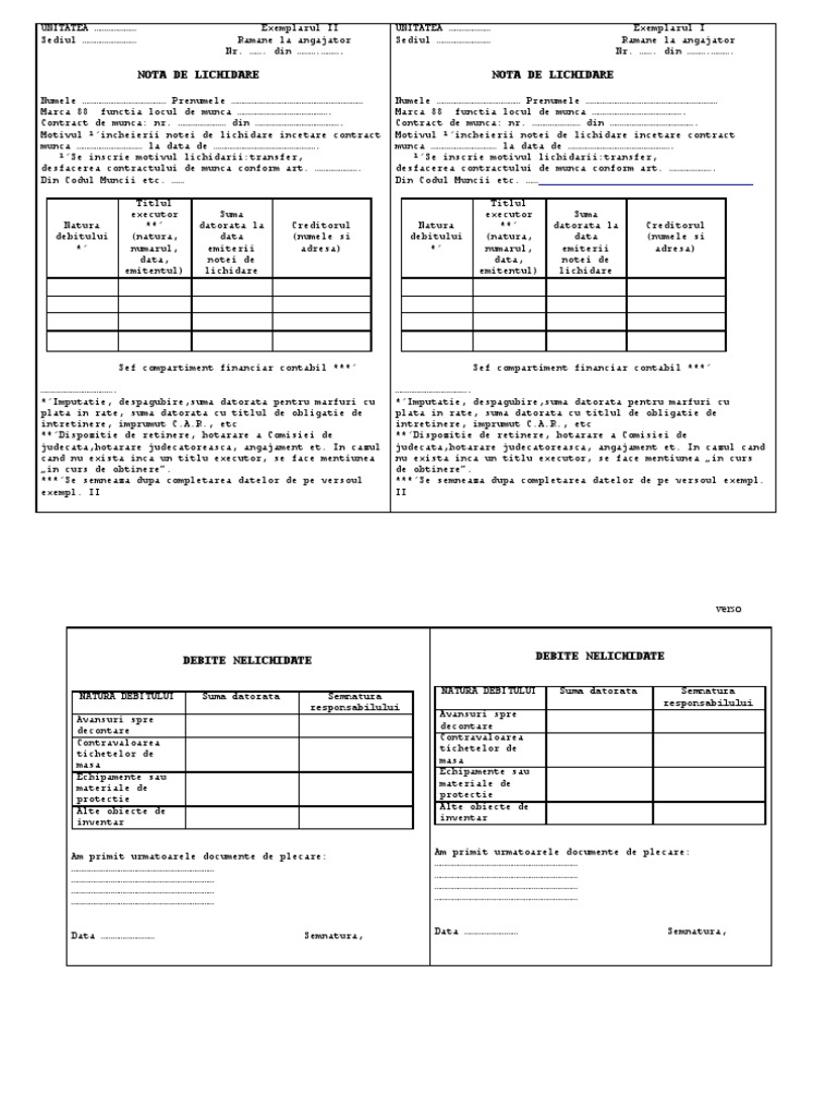 Numele Prenumele Marca 88 functia locul de munca . Contract de munca: nr. din . Motivul incheierii notei de lichidare incetare contract munca la data de . Se inscrie motivul lichidarii:transfer, desfacerea contractului de munca conform art. . Din Codul Muncii etc. Titlul executor ** (natura, numarul, data, emitentul) Suma datorata la data emiterii notei de lichidare