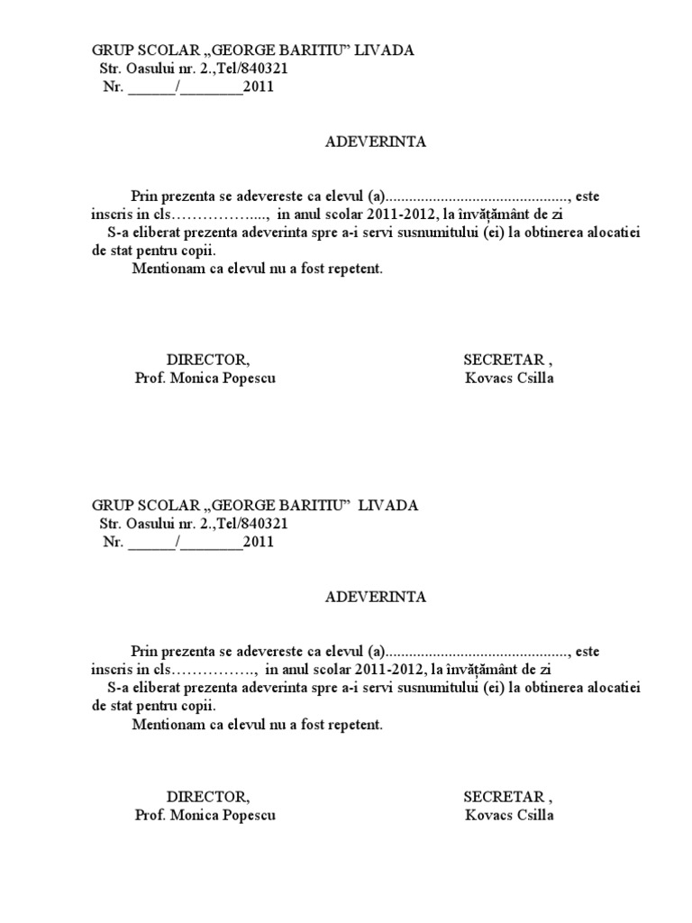 GRUP SCOLAR GEORGE BARITIU LIVADA Str. Oasului nr. 2.,Tel/840321 Nr. ______/________2011 ADEVERINTA Prin prezenta se adevereste ca elevul (a).............................................., este inscris in cls., in anul scolar 2011-2012, la nvmnt de zi S-a eliberat prezenta adeverinta spre a-i servi susnumitului (ei) la obtinerea alocatiei de stat pentru copii. Mentionam ca elevul nu a fost repetent.