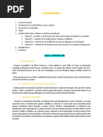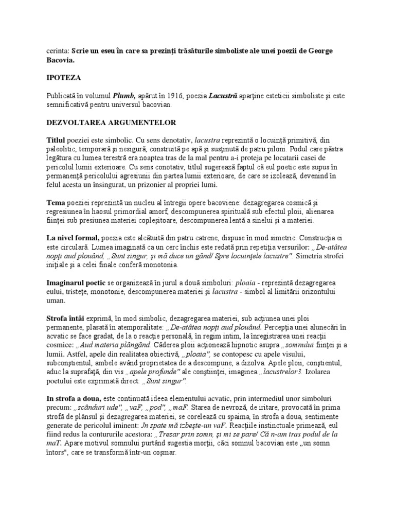 IPOTEZA Publicat n volumul Plumb, aprut n 1916, poezia Lacustr aparine esteticii simboliste i este semnificativ pentru universul bacovian. DEZVOLTAREA ARGUMENTELOR Titlul poeziei este simbolic. Cu sens denotativ, lacustra reprezint o locuin primitiv, din paleolitic, temporar i nesigur, construit pe ap i susinut de patru piloni. Podul care pstra legtura cu lumea terestr era noaptea tras de la mal pentru a-i proteja pe locatarii casei de pericolul lumii exterioare. Cu sens conotativ, titlul sugereaz faptul c eul poetic este supus n permanen pericolului agresiunii din partea lumii exterioare, de care se izoleaz, devenind n felul acesta un nsingurat, un prizonier al propriei lumi. Tema poeziei reprezint un nucleu al ntregii opere bacoviene: dezagregarea cosmic i regresiunea n haosul primordial amorf, descompunerea spiritual sub efectul ploii, alienarea fiinei sub presiunea materiei copleitoare, descompunerea lent a sinelui i a materiei. La nivel formal, poezia este alctuit din patru catrene, dispuse n mod simetric. Construcia ei este circular. Lumea imaginat ca un cerc nchis este redat prin repetiia versurilor: De-attea nopi aud plound, Sunt singur, i m duce un gnd/ Spre locuinele lacustre". Simetria strofei iniiale i a celei finale confer monotonia. Imaginarul poetic se organizeaz n jurul a dou simboluri: ploaia - reprezint dezagregarea eului, tristee, monotonie, descompunerea materiei i lacustra - simbol al limitrii orizontului uman. Strofa nti exprim, n mod simbolic, dezagregarea materiei, sub aciunea unei ploi permanente, plasat n atemporalitate: De-attea nopi aud plound. Percepia unei alunecri n acvatic se face gradat, de la o reacie personal, n regim intim, la nregistrarea unei reacii cosmice: Aud materia plngnd. Cderea ploii acioneaz hipnotic asupra somnului fiinei i a lumii. Astfel, apele din realitatea obiectiv, ploaia", se contopesc cu apele visului, subcontientul, ambele avnd proprietatea de a descompune, a dizolva. Apele ploii, contientul, aduc la suprafa, din vis apele profunde" ale contiinei, imaginea lacustrelor3. Izolarea poetului este exprimat direct: Sunt singur". In strofa a doua, este continuat ideea elementului acvatic, prin intermediul unor simboluri precum: scnduri ude", vaF, pod", maF. Starea de nevroz, de iritare, provocat n prima strof de plnsul i dezagregarea materiei, se coreleaz cu spaima, n strofa a doua, sentimente generate de pericolul iminent: Jn spate m izbete-un vaF. Reaciile instinctuale primeaz, eul fiind redus la contururile acestora: Tresar prin somn, i mi se pare/ C n-am tras podul de la maT. Apare motivul somnului purtnd sugestia morii, cci somnul bacovian este un somn ntors", care se transform ntr-un comar.