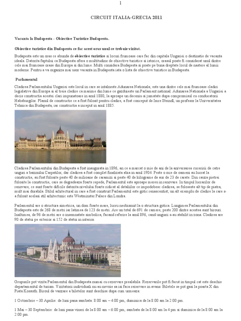 Vacanta la Budapesta - Obiective Turistice Budapesta. Obiective turistice din Budapesta ce fac acest oras unul ce trebuie vizitat. Budapesta este un oras ce abunda de obiective turistice si locuri frumoase care fac din capitala Ungariei o destinatie de vacanta ideala. Datorita faptului ca Budapesta ofera o multitudine de obiective turistice si istorice, orasul poate fi considerat unul dintre cele mai frumoase orase din Europa si din lume. Multi considera Budapesta si poate pe buna dreptate locul de nastere al lumii moderne. Pentru a va organiza mai usor vacanta in Budapesta iata o lista de obiective turistice in Budapesta. Parlamentul Cladirea Parlamentului Ungariei este locul in care se intalneste Adunarea Nationala; este una dintre cele mai frumoase cladiri legislative din Europa si al treia cladire ca marime din lume ce gazduieste un Parlament national. Adunarea Nationala a Ungariei a decis constructia acestei clari impunatoare in anul 1880, la aproape un deceniu si jumatate dupa compromisul cu conducatorii Habsburgilor. Planul de constructie ce a fost folosit pentru cladire, a fost conceput de Imre Steindl, un profesor la Universitatea Tehnica din Budapesta, iar constructia a inceput in anul 1885.