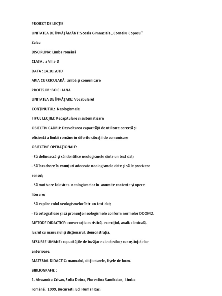 DATA : 14.10.2010 ARIA CURRICULAR: Limb i comunicare PROFESOR: BOIE LIANA UNITATEA DE NVARE: Vocabularul CONINUTUL: Neologismele TIPUL LECIEI: Recapitulare si sistematizare OBIECTIV CADRU: Dezvoltarea capacitii de utilizare corect i eficient a limbii romne n diferite situaii de comunicare OBIECTIVE OPERAIONALE: - S defineasc i s identifice neologismele dintr-un text dat; - S ncadreze n enunuri adecvate neologismele date i s le precizeze sensul; - S motiveze folosirea neologismelor n anumite contexte i opere literare; - S explice rolul neologismelor ntr-un text dat; - S ortografieze i s pronune neologismele conform normelor DOOM2. METODE DIDACTICE: conversaia euristic, exerciiul, analiza lexical, lucrul cu manualul i dicionarul, demonstraia. RESURSE UMANE: capacitile de nvare ale elevilor; cunotinele lor anterioare. MATERIAL DIDACTIC: manualul, dicionarele, fiele de lucru. BIBLIOGRAFIE : 1. Alexandru Crisan, Sofia Dobra, Florentina Samihaian, Limba romn, 1999, Bucuresti, Ed. Humanitas;