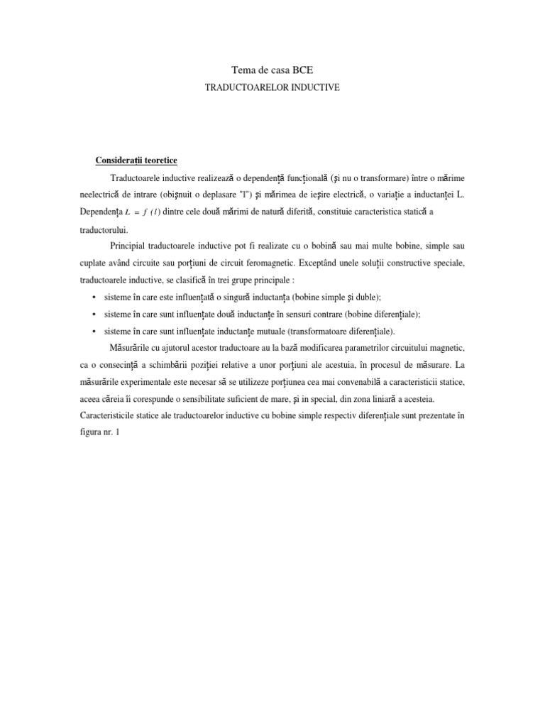 Consideraii teoretice Traductoarele inductive realizeaz o dependen funcional (i nu o transformare) ntre o mrime neelectric de intrare (obinuit o deplasare "l") i mrimea de ieire electric, o variaie a inductanei L. Dependena L = f ( l) dintre cele dou mrimi de natur diferit, constituie caracteristica static a traductorului. Principial traductoarele inductive pot fi realizate cu o bobin sau mai multe bobine, simple sau cuplate avnd circuite sau poriuni de circuit feromagnetic. Exceptnd unele soluii constructive speciale, traductoarele inductive, se clasific n trei grupe principale : sisteme n care este influenat o singur inductana (bobine simple i duble); sisteme n care sunt influenate dou inductane n sensuri contrare (bobine difereniale); sisteme n care sunt influenate inductane mutuale (transformatoare difereniale). Msurrile cu ajutorul acestor traductoare au la baz modificarea parametrilor circuitului magnetic, ca o consecin a schimbrii poziiei relative a unor poriuni ale acestuia, n procesul de msurare. La msurrile experimentale este necesar s se utilizeze poriunea cea mai convenabil a caracteristicii statice, aceea creia i corespunde o sensibilitate suficient de mare, i in special, din zona liniar a acesteia. Caracteristicile statice ale traductoarelor inductive cu bobine simple respectiv difereniale sunt prezentate n figura nr. 1