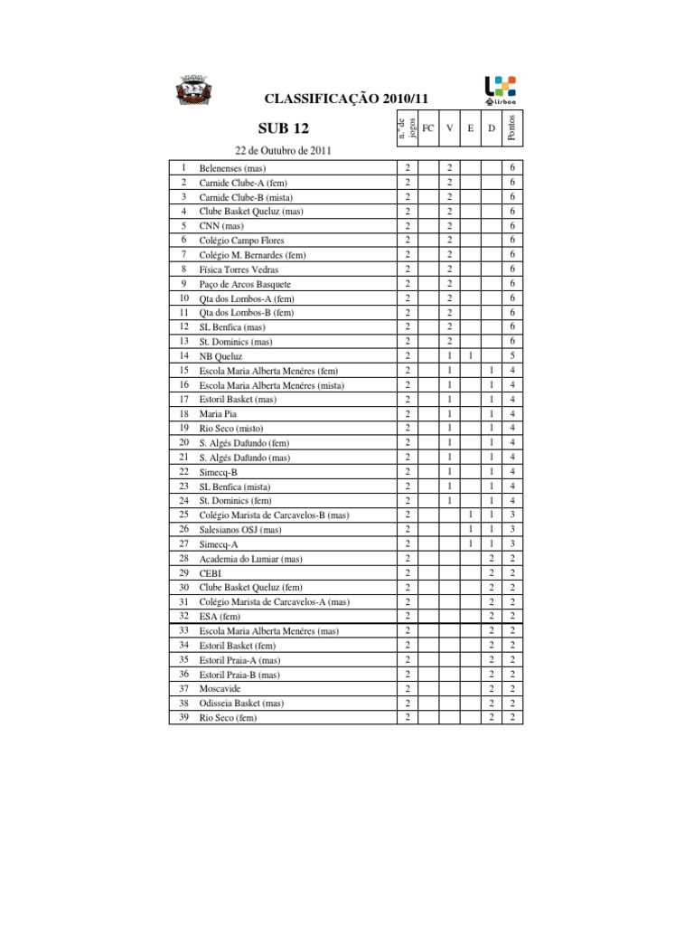 1 2 3 4 5 6 7 8 9 10 11 12 13 14 15 16 17 18 19 20 21 22 23 24 25 26 27 28 29 30 31 32 33 34 35 36 37 38 39 Belenenses (mas) Carnide Clube-A (fem) Carnide Clube-B (mista) Clube Basket Queluz (mas) CNN (mas) Colgio Campo Flores Colgio M. Bernardes (fem) Fsica Torres Vedras Pao de Arcos Basquete Qta dos Lombos-A (fem) Qta dos Lombos-B (fem) SL Benfica (mas) St. Dominics (mas) NB Queluz Escola Maria Alberta Menres (fem) Escola Maria Alberta Menres (mista) Estoril Basket (mas) Maria Pia Rio Seco (misto) S. Algs Dafundo (fem) S. Algs Dafundo (mas) Simecq-B SL Benfica (mista) St. Dominics (fem) Colgio Marista de Carcavelos-B (mas) Salesianos OSJ (mas) Simecq-A Academia do Lumiar (mas) CEBI Clube Basket Queluz (fem) Colgio Marista de Carcavelos-A (mas) ESA (fem) Escola Maria Alberta Menres (mas) Estoril Basket (fem) Estoril Praia-A (mas) Estoril Praia-B (mas) Moscavide Odisseia Basket (mas) Rio Seco (fem)