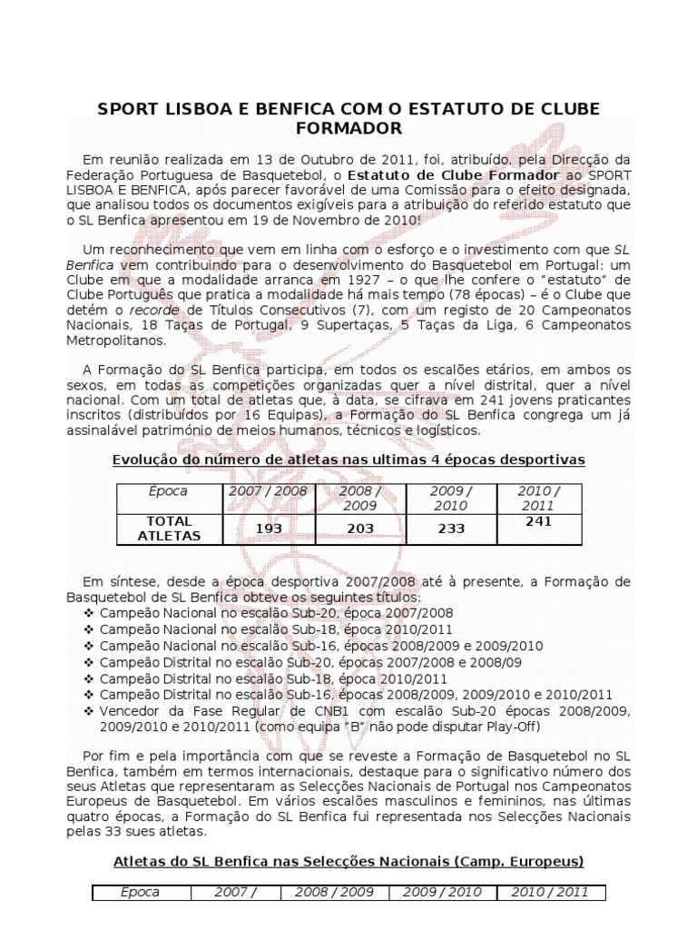 Em reunio realizada em 13 de Outubro de 2011, foi, atribudo, pela Direco da Federao Portuguesa de Basquetebol, o Estatuto de Clube Formador ao SPORT LISBOA E BENFICA, aps parecer favorvel de uma Comisso para o efeito designada, que analisou todos os documentos exigveis para a atribuio do referido estatuto que o SL Benfica apresentou em 19 de Novembro de 2010! Um reconhecimento que vem em linha com o esforo e o investimento com que SL Benfica vem contribuindo para o desenvolvimento do Basquetebol em Portugal: um Clube em que a modalidade arranca em 1927 o que lhe confere o estatuto de Clube Portugus que pratica a modalidade h mais tempo (78 pocas) o Clube que detm o recorde de Ttulos Consecutivos (7), com um registo de 20 Campeonatos Nacionais, 18 Taas de Portugal, 9 Supertaas, 5 Taas da Liga, 6 Campeonatos Metropolitanos. A Formao do SL Benfica participa, em todos os escales etrios, em ambos os sexos, em todas as competies organizadas quer a nvel distrital, quer a nvel nacional. Com um total de atletas que, data, se cifrava em 241 jovens praticantes inscritos (distribudos por 16 Equipas), a Formao do SL Benfica congrega um j assinalvel patrimnio de meios humanos, tcnicos e logsticos. Evoluo do nmero de atletas nas ultimas 4 pocas desportivas poca TOTAL ATLETAS 2007 / 2008 193 2008 / 2009 203 2009 / 2010 233 2010 / 2011 241