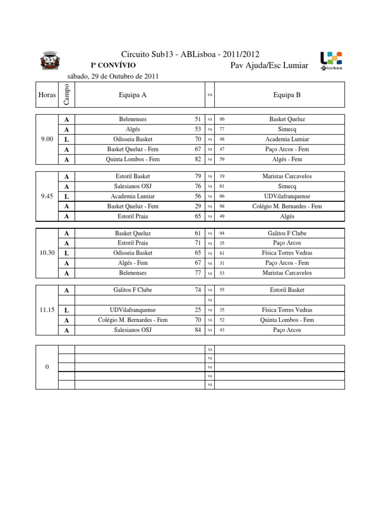 Basket Queluz Simecq Academia Lumiar Pao Arcos - Fem Algs - Fem Maristas Carcavelos Simecq UDVilafranquense Colgio M. Bernardes - Fem Algs Galitos F Clube Pao Arcos Fsica Torres Vedras Pao Arcos - Fem Maristas Carcavelos Estoril Basket Fsica Torres Vedras Quinta Lombos - Fem Pao Arcos