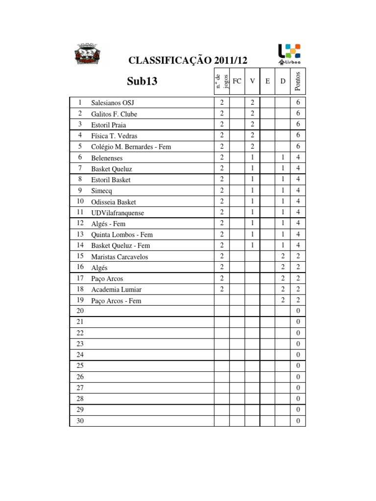 1 2 3 4 5 6 7 8 9 10 11 12 13 14 15 16 17 18 19 20 21 22 23 24 25 26 27 28 29 30 Salesianos OSJ Galitos F. Clube Estoril Praia Fsica T. Vedras Colgio M. Bernardes - Fem Belenenses Basket Queluz Estoril Basket Simecq Odisseia Basket UDVilafranquense Algs - Fem Quinta Lombos - Fem Basket Queluz - Fem Maristas Carcavelos Algs Pao Arcos Academia Lumiar Pao Arcos - Fem