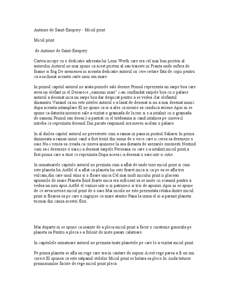 care era cel mai bun prieten al [Link] ne mai spune ca acest prieten al sau traieste in Franta unde sufera de foame si [Link] asemenea in aceasta dedicatie autorul isi cere iertare fata de copii pentru ca a inchinat aceasta carte unui om mare. In primul capitol autorul ne arata primele sale [Link] reprezenta un sarpe boa care avea un elefant in [Link] oamenii mari i-au confundat sarpele boa cu o palarie autorul a desenat inca un sarpe boa dar despicat pentru a se vedea clar elefantul [Link] ca nu este inteles autorul s-a lasat de desenat si nu a mai desenat nimic dupa aceasta [Link] ne spune ca si-a ales ca mesrie sa conduca [Link] ni se spune ca datorita meseriei sale a vizitat o gramada de locuri si s-a intalnit cu o gramada de [Link] sau desen l-a pastrat cu el totdeauna si cand intalnea pe cineva il intreba ce reprezinta [Link] pacate raspunsul era mereu acelasi:o palarie. In al doilea capitol autorul ne povesteste cum a ramas in pana in pustiul [Link] prima dimineata a ramas uimit cand a fost trezit din somn de o voce care ii cerea sa deseneze o [Link]-i venea sa creada ca cineva ajunsese la asa distanta de asezarile [Link] cum sa-i deseneze o oaie,i-a desenat [Link] cu care s-a intalnit,micul print,a fost prima care a stiut ce [Link] aceea i-a desenat o oaie intr-o cutie. In urmatoarele capitole autorul ne prezinta cum a aflat de unde vine micul print si cum este planeta [Link] el a aflat ca planeta lui este foaret mica si ca pe ea se afla trei vulcani,din care unul stins si o floare [Link] mai mult micului print ii placeau apusurile de [Link] fiind foarte mica era suficient sa se mute cu scaunul pentru a vedea un nou [Link] el vazuse intr-o zi patruzeci si trei de [Link] ni se spune de ce avea nevioe micul print de o [Link] incolo ne este prezentata relatia dintre micul print si floarea sa pe care o ingrijise cu mare [Link] la urma el si-a parasit planeta tocmai din cauza acestei flori.