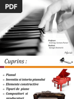 Pianul a aparut odata cu evolutia interpretarii muzicii instrumentale, ca o necesitate. Mentionam principalele instrumente muzicale care au precedat pianul: clavicordul si policordul aprox. anul 1500 apoi spineta sub diferite forme, o varianta fiind clavecinul. La inceput sunetul se obtinea cu ajutorul unui stift sau pene metalice. Aproximativ la inceputul anilor 1800 apare inventia lui Pantoleon, un tambal imbunatatit, stramosul pianului, folosea acum ciocanele care prin lovirea cu ele a corzilor se obtinea sunetul. Daca clavicordul consta dintr-o clapa care in prelungire spre interior se termina cu o limba metalica sau cu un stift care executa o miscare asemanatoare arcusului de vioara pe coarda, la clavecin sunetul se obtinea prin ciupirea corzilor cu o pana. Primul clavecin a martelleti ( cu ciocanele) a fost construit intre 1709 si 1711 de Bartolomeo di Francesco Cristofori, dar a fost finalizat in 1726. Acesta este de fapt primul instrument cu ciocanele si reprezinta baza mecanismului de pian utilizata cel mai frecvent inca si in zilele noastre. Acest mecanism avea intinderea de 4 octave si era dotat deja cu articulatie dubla, decuplare si pentru fiecare nota cate o surdina. In aceeasi perioada francezul Marius si organistul german Schrter inventeaza pianul cu ciocanele care sunt recunoscuti public iar Gottfried Silbermann inventeaza pianina. Istoria pianului nu este inca pe deplin clarificata. Totusi ideea de a construi un asemenea instrument apartine germanilor datorita carora s-a raspandit acest tip de inventii. Prin stradania constructorului de orgi Silbermann in Strassburg, Freiberg si Dresda modelul lui Cristofori a fost perfectionat continuu si a capatat o valoare noua. Toate modelele de piane au fost cunoscute sub numele de Pianoforte. Aceasta denumire vine datorita faptului ca prin bataia ciocanelelor mai tare sau mai slaba se puteau obtine nuante, la clavecin trebuia sa se cante pe o a doua tastatura. Sunetul obtinut de clavecin era mai slab, pierzandu-se repede, spre deosebire de pian care permite lungirea si intarirea lui cu ajutorul pedalelor si mecanismului cu ciocanele, modelarea sunetului se face mult mai usor, realizandu-se o interpretare deosebita. In jurul anului 1910 principalele fabrici de piane sunt in Leipzig, Berlin, New-York, Paris, Stuttgart si Bremen. Sunt renumite firmele: Blthner, Bechstein, Steinway, Erard Sebastien, Lipp & Sohn, August Frster, Schiedmayer care au proprii lor inventatori de piane. Acum aceste instrumente incep sa fie fabricate sub diferite forme, unele pastrand un design arhaic. Astfel pianul cu coada numit simplu pian este destinat incaperilor mari si mai ales concertelor, depasind lungimea de 2 m, fiind sustinut de 3 picioare si posedand o mecanica diferita de pianine. Spre deosebire de pian care e asezat orizontal ( ca un tambal mai mare), pianina este mai mica si este destinata incaperilor mici, avand mecanica asezata in pozitie verticala, fiind mai ieftina decat pianul cu coada.