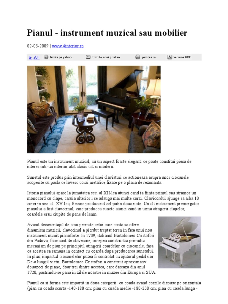 230-300 cm) si pianina, cu corzi dispuse pe plan vertical. Printre cele mai cunoscute firme producatoare de piane sunt astazi Steinway and Sons (SUA si Germania), C. Bechstein (Germania), Blthner(Germania), Bsendorfer (Austria), Yamaha (Japonia), Kawai (Japonia). Un pian este o piesa eleganta care se potriveste livingurilor spatioase. Forma binecunoscuta ofera prestanta unei incaperi, constituindu-se de asemenea intr-o piesa de mobilier de la care porneste intreaga amenajare, iar designul interior este planificat in functie de stilul pianului. Dar pianul nu se poate considera doar o piesa de mobilier ca oricare alta, pozitionarea lui intrun interior si decorarea spatiului joaca un rol foarte important. De regula pianul nu se pozitioneaza in dreptul unui perete exterior si nici in dreptul ferestrei, evitandu-se astfel curentii de aer rece si umezeala. Pentru un sunet ideal, camera in care dorim sa avem un pian cu coada, trebuie sa fie de cel putin doua ori mai mare decat lungimea lui, iar inaltimea nu trebuie sa fie mai mare de 3,5m. Pentru un sunet bun, camera ar trebui sa fie lunga, pentru ca in cazul peretilor apropiati sunetul se propaga din perete in perete. Odata pianul pozitionat, aranjarea mobilierului se va face in functie de acesta - fie in jurul pianului, pentru a asculta ceea ce se canta, fie in coltul opus pianului, pentru a echilibra ambientarea. Pentru ca sunetul vibreaza si se transmite prin pereti, ferestre, tavan si podea, trebuie gasita combinatia ideala de materiale care sa absoarba sunetul, dar in acelasi timp sa nu afecteze acustica din camera. Sub picioarele pianului se recomanda pozitionarea unui covor pentru a absorbi sunetul. In cazul draperiilor, tipul si grosimea lor joaca un rol important in absortia sunetului, precum si canapelele si mobilierul tapitat. Pianul este pretentios, in sensul ca are nevoie de lux si somptuozitate, el insusi exprimand aceste caracteristici. Obiectele decorative trebuie sa fie in concordanta cu acest lucru, iar mobilierul sa corespunda stilului pianului. Avand pe scurt aceste informatii despre pian in general si despre modul in care trebuie sa gandim amenajarea pornind de la pian, un instrument muzical si totodata o piesa de mobilier, nu ne ramane decat sa invatam sa cantam.