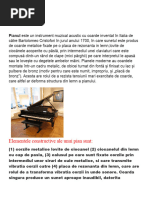 Pianul este un instrument muzical, cu un aspect foarte elegant, ce poate constitui piesa de interes intr-un interior atat clasic cat si modern. Sunetul este produs prin intermediul unei claviaturi ce actioneaza asupra unor ciocanele acoperite cu pasla ce lovesc corzi metalice fixate pe o placa de rezonanta. Istoria pianului apare la jumatatea sec. al XII-lea atunci cand ia fiinta primul sau stramos un monocord cu clape, caruia ulterior i se adauga mai multe corzi. Clavicordul ajunge sa aiba 10 corzi in sec. al. XV-lea, fiecare producand cel putin doua note. Un alt instrument premergator pianului a fost clavecinul, care producea sunete atunci cand in urma atingerii clapelor, coardele erau ciupite de pene de lemn. Avand dezavantajul de a nu permite celui care canta sa ofere dinamism muzicii, clavecinul a pierdut treptat teren in fata unui nou instrument numit pianoforte. In 1709, italianul Bartolomeo Cristofori din Padova, fabricant de clavecine, incepea constructia primului mecanism de pian pe principiul atingerii coardelor cu ciocanele, fara ca acestea sa ramana in contact cu coarda dupa producerea sunetului. In plus, impactul ciocanelelor putea fi controlat cu ajutorul pedalelor. De-a lungul vietii, Bartolomeo Cristofori a construit aproximativ douazeci de piane, doar trei dintre acestea, care dateaza din anul 1720, pastrindu-se pana in zilele noastre in muzee din Europa si SUA. Pianul ca si forma este impartit in doua categorii: cu coada avand corzile dispuse pe orizontala (pian cu coada scurta -140-180 cm; pian cu coada medie -180-230 cm; pian cu coada lunga -