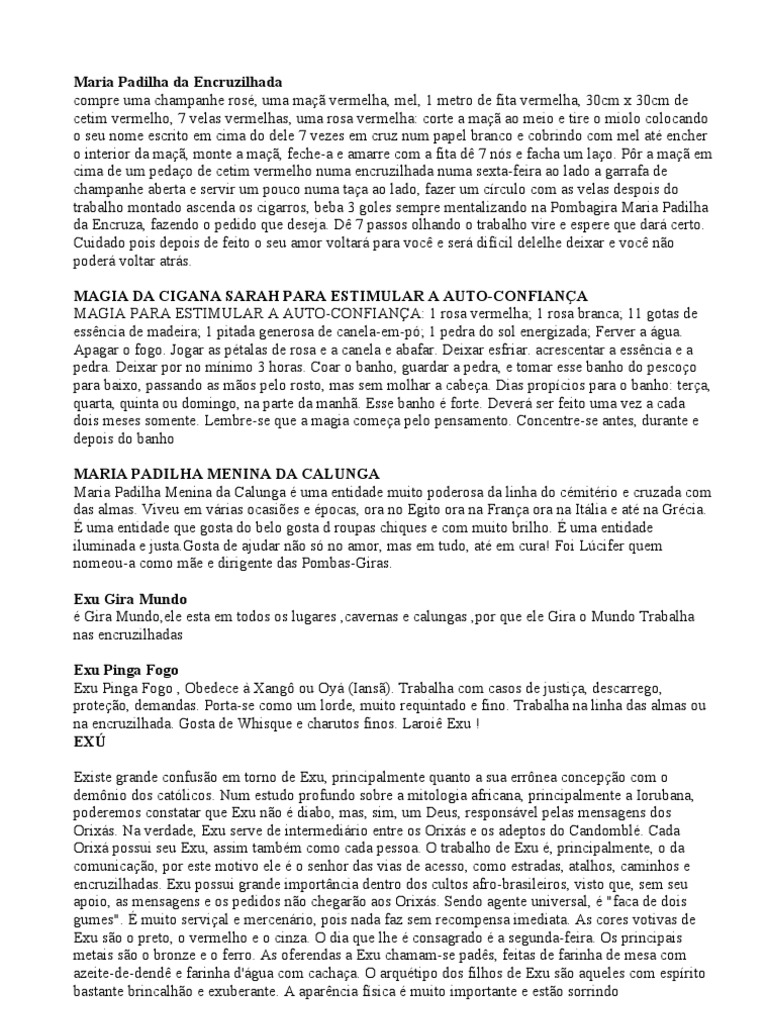 de cetim vermelho, 7 velas vermelhas, uma rosa vermelha: corte a ma ao meio e tire o miolo colocando o seu nome escrito em cima do dele 7 vezes em cruz num papel branco e cobrindo com mel at encher o interior da ma, monte a ma, feche-a e amarre com a fita d 7 ns e facha um lao. Pr a ma em cima de um pedao de cetim vermelho numa encruzilhada numa sexta-feira ao lado a garrafa de champanhe aberta e servir um pouco numa taa ao lado, fazer um crculo com as velas despois do trabalho montado ascenda os cigarros, beba 3 goles sempre mentalizando na Pombagira Maria Padilha da Encruza, fazendo o pedido que deseja. D 7 passos olhando o trabalho vire e espere que dar certo. Cuidado pois depois de feito o seu amor voltar para voc e ser difcil delelhe deixar e voc no poder voltar atrs. MAGIA DA CIGANA SARAH PARA ESTIMULAR A AUTO-CONFIANA MAGIA PARA ESTIMULAR A AUTO-CONFIANA: 1 rosa vermelha; 1 rosa branca; 11 gotas de essncia de madeira; 1 pitada generosa de canela-em-p; 1 pedra do sol energizada; Ferver a gua. Apagar o fogo. Jogar as ptalas de rosa e a canela e abafar. Deixar esfriar. acrescentar a essncia e a pedra. Deixar por no mnimo 3 horas. Coar o banho, guardar a pedra, e tomar esse banho do pescoo para baixo, passando as mos pelo rosto, mas sem molhar a cabea. Dias propcios para o banho: tera, quarta, quinta ou domingo, na parte da manh. Esse banho forte. Dever ser feito uma vez a cada dois meses somente. Lembre-se que a magia comea pelo pensamento. Concentre-se antes, durante e depois do banho MARIA PADILHA MENINA DA CALUNGA Maria Padilha Menina da Calunga uma entidade muito poderosa da linha do cmitrio e cruzada com das almas. Viveu em vrias ocasies e pocas, ora no Egito ora na Frana ora na Itlia e at na Grcia. uma entidade que gosta do belo gosta d roupas chiques e com muito brilho. uma entidade iluminada e justa.Gosta de ajudar no s no amor, mas em tudo, at em cura! Foi Lcifer quem nomeou-a como me e dirigente das Pombas-Giras. Exu Gira Mundo Gira Mundo,ele esta em todos os lugares ,cavernas e calungas ,por que ele Gira o Mundo Trabalha nas encruzilhadas Exu Pinga Fogo Exu Pinga Fogo , Obedece Xang ou Oy (Ians). Trabalha com casos de justia, descarrego, proteo, demandas. Porta-se como um lorde, muito requintado e fino. Trabalha na linha das almas ou na encruzilhada. Gosta de Whisque e charutos finos. Laroi Exu ! EX Existe grande confuso em torno de Exu, principalmente quanto a sua errnea concepo com o demnio dos catlicos. Num estudo profundo sobre a mitologia africana, principalmente a Iorubana, poderemos constatar que Exu no diabo, mas, sim, um Deus, responsvel pelas mensagens dos Orixs. Na verdade, Exu serve de intermedirio entre os Orixs e os adeptos do Candombl. Cada Orix possui seu Exu, assim tambm como cada pessoa. O trabalho de Exu , principalmente, o da comunicao, por este motivo ele o senhor das vias de acesso, como estradas, atalhos, caminhos e encruzilhadas. Exu possui grande importncia dentro dos cultos afro-brasileiros, visto que, sem seu apoio, as mensagens e os pedidos no chegaro aos Orixs. Sendo agente universal, "faca de dois gumes". muito servial e mercenrio, pois nada faz sem recompensa imediata. As cores votivas de Exu so o preto, o vermelho e o cinza. O dia que lhe consagrado a segunda-feira. Os principais metais so o bronze e o ferro. As oferendas a Exu chamam-se pads, feitas de farinha de mesa com azeite-de-dend e farinha d'gua com cachaa. O arqutipo dos filhos de Exu so aqueles com esprito bastante brincalho e exuberante. A aparncia fsica muito importante e esto sorrindo