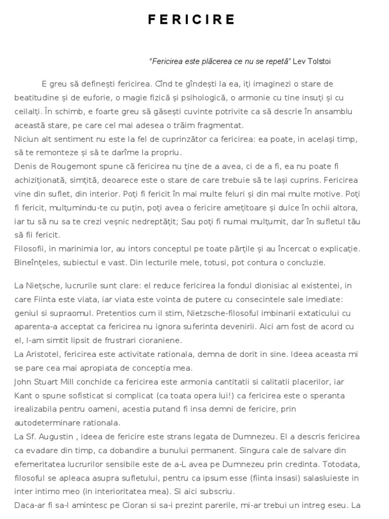 Fericirea este plcerea ce nu se repet Lev Tolstoi E greu s defineti fericirea. Cnd te gndeti la ea, ii imaginezi o stare de beatitudine i de euforie, o magie fizic i psihologic, o armonie cu tine insui i cu ceilali. n schimb, e foarte greu s gseti cuvinte potrivite ca s descrie n ansamblu aceast stare, pe care cel mai adesea o trim fragmentat. Niciun alt sentiment nu este la fel de cuprinztor ca fericirea: ea poate, in acelai timp, s te remonteze i s te darme la propriu. Denis de Rougemont spune c fericirea nu ine de a avea, ci de a fi, ea nu poate fi achiziionat, simit, deoarece este o stare de care trebuie s te lai cuprins. Fericirea vine din suflet, din interior. Poi fi fericit n mai multe feluri i din mai multe motive. Poi fi fericit, mulumindu-te cu puin, poi avea o fericire ameitoare i dulce n ochii altora, iar tu s nu sa te crezi venic nedreptit; Sau poi fi numai mulumit, dar n sufletul tu s fii fericit. Filosofii, in marinimia lor, au intors conceptul pe toate prile i au ncercat o explicaie. Bineneles, subiectul e vast. Din lecturile mele, totusi, pot contura o concluzie. La Niesche, lucrurile sunt clare: el reduce fericirea la fondul dionisiac al existentei, in care Fiinta este viata, iar viata este vointa de putere cu consecintele sale imediate: geniul si supraomul. Pretentios cum il stim, Nietzsche-filosoful imbinarii extaticului cu aparenta-a acceptat ca fericirea nu ignora suferinta devenirii. Aici am fost de acord cu el, l-am simtit lipsit de frustrari cioraniene. La Aristotel, fericirea este activitate rationala, demna de dorit in sine. Ideea aceasta mi se pare cea mai apropiata de conceptia mea. John Stuart Mill conchide ca fericirea este armonia cantitatii si calitatii placerilor, iar Kant o spune sofisticat si complicat (ca toata opera lui!) ca fericirea este o speranta irealizabila pentru oameni, acestia putand fi insa demni de fericire, prin autodeterminare rationala. La Sf. Augustin , ideea de fericire este strans legata de Dumnezeu. El a descris fericirea ca evadare din timp, ca dobandire a bunului permanent. Singura cale de salvare din efemeritatea lucrurilor sensibile este de a-L avea pe Dumnezeu prin credinta. Totodata, filosoful se apleaca asupra sufletului, pentru ca ipsum esse (fiinta insasi) salasluieste in inter intimo meo (in interioritatea mea). Si aici subscriu. Daca-ar fi sa-l amintesc pe Cioran si sa-i prezint parerile, mi-ar trebui un intreg eseu. La