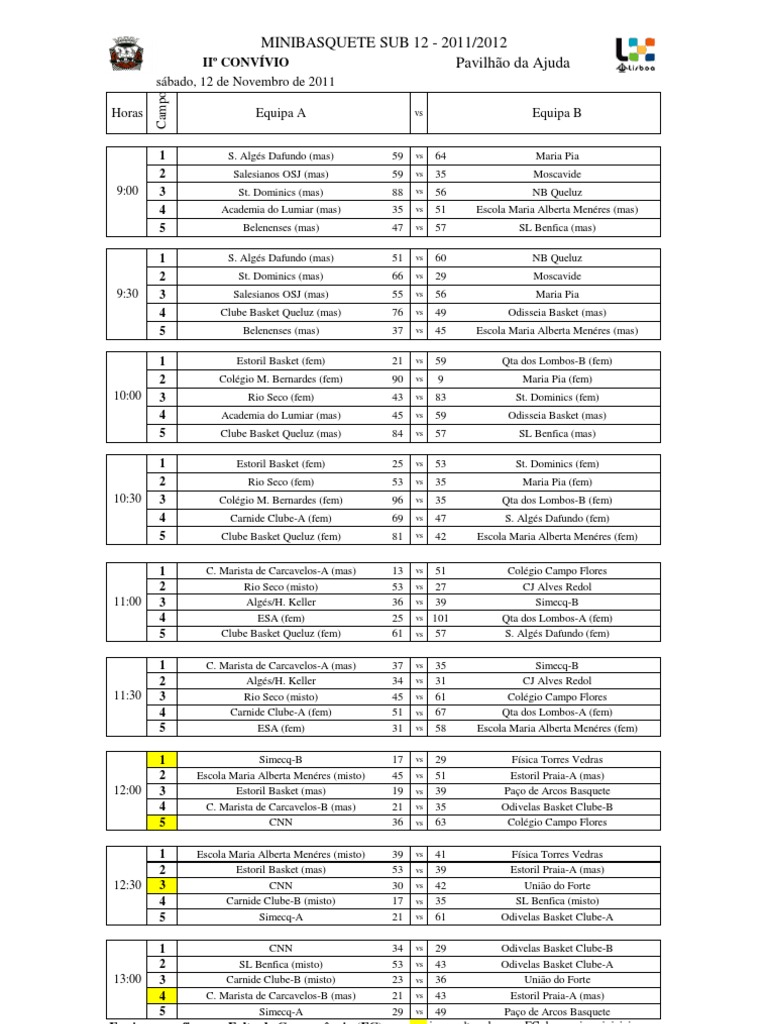 Academia do Lumiar (mas) Belenenses (mas) S. Algs Dafundo (mas) St. Dominics (mas) Salesianos OSJ (mas) Clube Basket Queluz (mas) Belenenses (mas) Estoril Basket (fem) Colgio M. Bernardes (fem) Rio Seco (fem) Academia do Lumiar (mas) Clube Basket Queluz (mas) Estoril Basket (fem) Rio Seco (fem) Colgio M. Bernardes (fem) Carnide Clube-A (fem) Clube Basket Queluz (fem) C. Marista de Carcavelos-A (mas) Rio Seco (misto) Algs/H. Keller ESA (fem) Clube Basket Queluz (fem) C. Marista de Carcavelos-A (mas) Algs/H. Keller Rio Seco (misto) Carnide Clube-A (fem) ESA (fem) Simecq-B Escola Maria Alberta Menres (misto) Estoril Basket (mas) C. Marista de Carcavelos-B (mas) CNN Escola Maria Alberta Menres (misto) Estoril Basket (mas) CNN Carnide Clube-B (misto) Simecq-A CNN SL Benfica (misto) Carnide Clube-B (misto) C. Marista de Carcavelos-B (mas) Simecq-A
