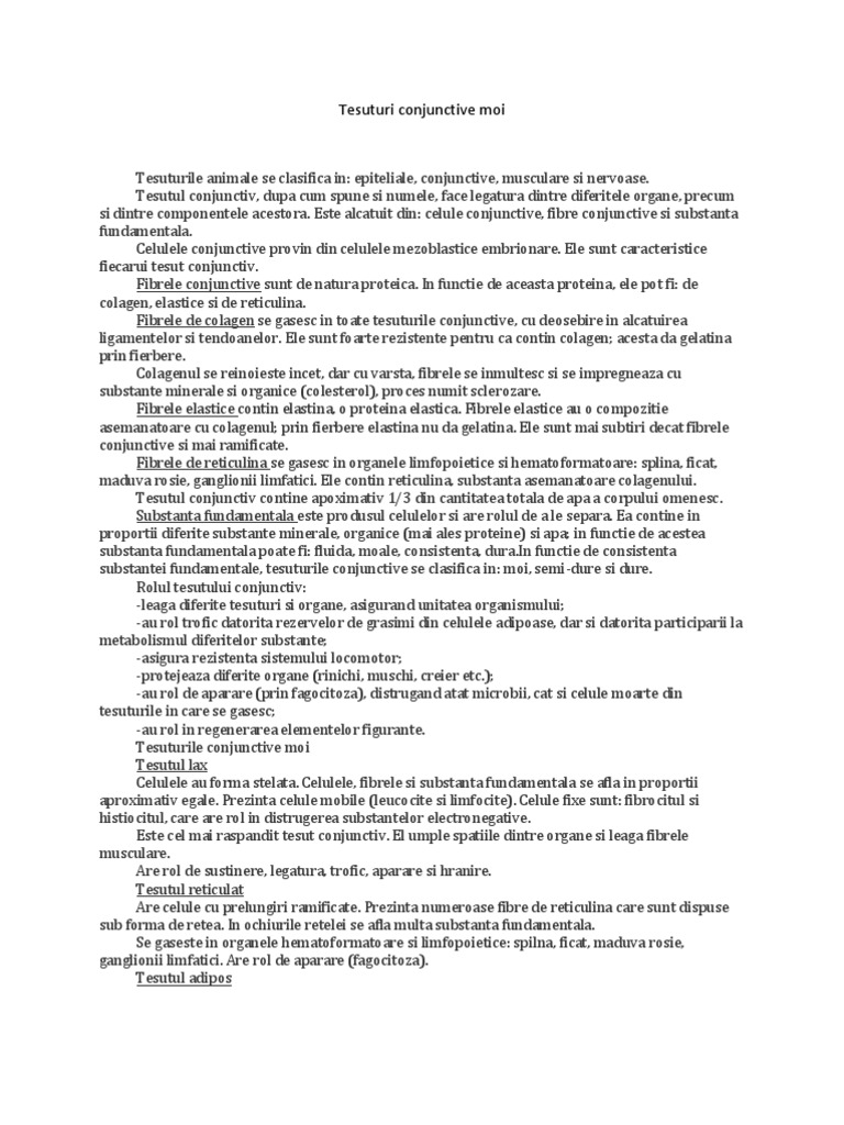 Tesuturile animale se clasifica in: epiteliale, conjunctive, musculare si nervoase. Tesutul conjunctiv, dupa cum spune si numele, face legatura dintre diferitele organe, precum si dintre componentele acestora. Este alcatuit din: celule conjunctive, fibre conjunctive si substanta fundamentala. Celulele conjunctive provin din celulele mezoblastice embrionare. Ele sunt caracteristice fiecarui tesut conjunctiv. Fibrele conjunctive sunt de natura proteica. In functie de aceasta proteina, ele pot fi: de colagen, elastice si de reticulina. Fibrele de colagen se gasesc in toate tesuturile conjunctive, cu deosebire in alcatuirea ligamentelor si tendoanelor. Ele sunt foarte rezistente pentru ca contin colagen; acesta da gelatina prin fierbere. Colagenul se reinoieste incet, dar cu varsta, fibrele se inmultesc si se impregneaza cu substante minerale si organice (colesterol), proces numit sclerozare. Fibrele elastice contin elastina, o proteina elastica. Fibrele elastice au o compozitie asemanatoare cu colagenul; prin fierbere elastina nu da gelatina. Ele sunt mai subtiri decat fibrele conjunctive si mai ramificate. Fibrele de reticulina se gasesc in organele limfopoietice si hematoformatoare: splina, ficat, maduva rosie, ganglionii limfatici. Ele contin reticulina, substanta asemanatoare colagenului. Tesutul conjunctiv contine apoximativ 1/3 din cantitatea totala de apa a corpului omenesc. Substanta fundamentala este produsul celulelor si are rolul de a le separa. Ea contine in proportii diferite substante minerale, organice (mai ales proteine) si apa; in functie de acestea substanta fundamentala poate fi: fluida, moale, consistenta, [Link] functie de consistenta substantei fundamentale, tesuturile conjunctive se clasifica in: moi, semi-dure si dure. Rolul tesutului conjunctiv: -leaga diferite tesuturi si organe, asigurand unitatea organismului; -au rol trofic datorita rezervelor de grasimi din celulele adipoase, dar si datorita participarii la metabolismul diferitelor substante; -asigura rezistenta sistemului locomotor; -protejeaza diferite organe (rinichi, muschi, creier etc.); -au rol de aparare (prin fagocitoza), distrugand atat microbii, cat si celule moarte din tesuturile in care se gasesc; -au rol in regenerarea elementelor figurante. Tesuturile conjunctive moi Tesutul lax Celulele au forma stelata. Celulele, fibrele si substanta fundamentala se afla in proportii aproximativ egale. Prezinta celule mobile (leucocite si limfocite). Celule fixe sunt: fibrocitul si histiocitul, care are rol in distrugerea substantelor electronegative. Este cel mai raspandit tesut conjunctiv. El umple spatiile dintre organe si leaga fibrele musculare. Are rol de sustinere, legatura, trofic, aparare si hranire. Tesutul reticulat Are celule cu prelungiri ramificate. Prezinta numeroase fibre de reticulina care sunt dispuse sub forma de retea. In ochiurile retelei se afla multa substanta fundamentala. Se gaseste in organele hematoformatoare si limfopoietice: spilna, ficat, maduva rosie, ganglionii limfatici. Are rol de aparare (fagocitoza). Tesutul adipos