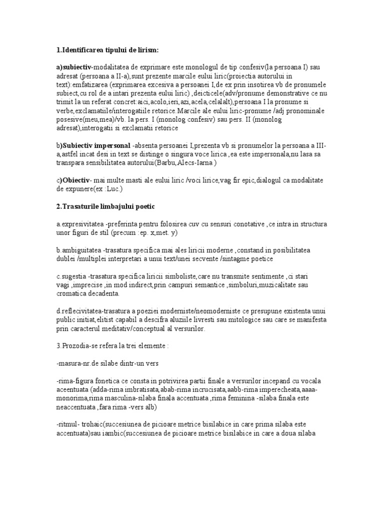 Identificarea tipului de lirism: a)subiectiv-modalitatea de exprimare este monologul de tip confesiv(la persoana I) sau adresat (persoana a II-a),sunt prezente marcile eului liric(proiectia autorului in text):emfatizarea (exprimarea excesiva a persoanei I,de ex prin insotirea vb de pronumele subiect,cu rol de a intari prezenta eului liric) ,deicticele(adv/pronume demonstrative ce nu trimit la un referat concret:aici,acolo,ieri,azi,acela,celalalt),persoana I la pronume si verbe,exclamatiile/interogatiile [Link] ale eului liric-pronume /adj pronominale posesive(meu,mea)/vb. la pers. I (monolog confesiv) sau pers. II (monolog adresat),interogatii si exclamatii retorice b)Subiectiv impersonal -absenta persoanei I,prezenta vb si pronumelor la persoana a IIIa,astfel incat desi in text se distinge o singura voce lirica ,ea este impersonala,nu lasa sa transpara sensibilitatea autorului(Barbu,Alecs-Iarna ) c)Obiectiv- mai multe masti ale eului liric /voci lirice,vag fir epic,dialogul ca modalitate de expunere(ex :Luc.) [Link] limbajului poetic [Link] -preferinta pentru folosirea cuv cu sensuri conotative ,ce intra in structura unor figuri de stil (precum :ep. x,met. y) [Link] -trasatura specifica mai ales liricii moderne ,constand in posibilitatea dublei /multiplei interpretari a unui text/unei secvente /sintagme poetice [Link] -trasatura specifica liricii simboliste,care nu transmite sentimente ,ci stari vagi ,imprecise ,in mod indirect,prin campuri semantice ,simboluri,muzicalitate sau cromatica decadenta. [Link]-trasatura a poeziei moderniste/neomoderniste ce presupune existenta unui public initiat,elitist capabil a descifra aluziile livresti sau mitologice sau care se manifesta prin caracterul meditativ/conceptual al versurilor. [Link]-se refera la trei elemente : -[Link] silabe dintr-un vers -rima-figura fonetica ce consta in potrivirea partii finale a versurilor incepand cu vocala aceentuata (adda-rima imbratisata,abab-rima incrucisata,aabb-rima imperecheata,aaaamonorima,rima masculina-silaba finala accentuata ,rima feminina -silaba finala este neaccentuata ,fara rima -vers alb) -ritmul- trohaic(succesiunea de picioare metrice bisilabice in care prima silaba este accentuata)sau iambic(succesiunea de picioare metrice bisilabice in care a doua silaba