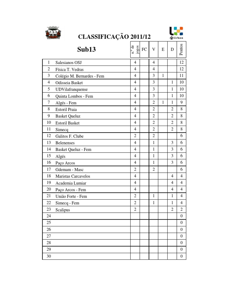 1 2 3 4 5 6 7 8 9 10 11 12 13 14 15 16 17 18 19 20 21 22 23 24 25 26 27 28 29 30 Salesianos OSJ Fsica T. Vedras Colgio M. Bernardes - Fem Odisseia Basket UDVilafranquense Quinta Lombos - Fem Algs - Fem Estoril Praia Basket Queluz Estoril Basket Simecq Galitos F. Clube Belenenses Basket Queluz - Fem Algs Pao Arcos Gdemam - Masc Maristas Carcavelos Academia Lumiar Pao Arcos - Fem Unio Forte - Fem Simecq - Fem Scalipus