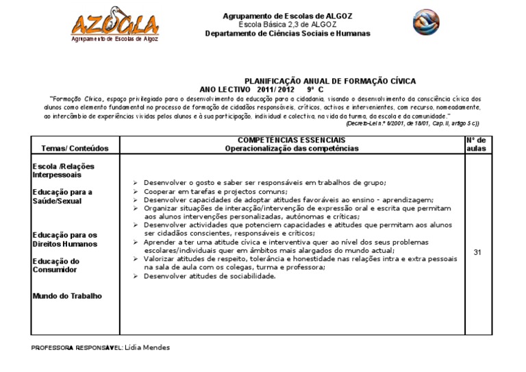 Formao Cvica, espao privilegiado para o desenvolvimento da educao para a cidadania, visando o desenvolvimento da conscincia cvica dos alunos como elemento fundamental no processo de formao de cidados responsveis, crticos, activos e intervenientes, com recurso, nomeadamente, ao intercmbio de experincias vividas pelos alunos e sua participao, individual e colectiva, na vida da turma, da escola e da comunidade.