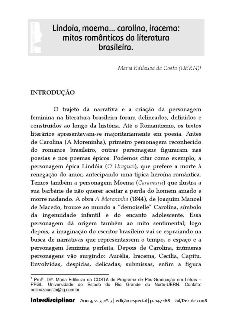 Lindoia, moema carolina, iracema: mitos românticos da literatura brasileira.