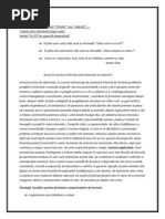 5. ZIUA INTERNAIONAL A POEZIEI MUZICA CUVINTELOR (de la literatur la muzic) Data (perioada de desfurare): martie 2012 Locul de desfurare: Sala de clas Participani: elevii claselor V-VIII DESCRIEREA ACTIVITII: activitatea i propune descoperirea unor melodii pe versurile autorilor studiai, familiarizarea elevilor cu conceptul de ars poetica i definirea poeziei n concepia celor mai reprezentativi poei romni, urmrirea unei prezentri power-point, recital de poezie. Responsabil:coordonatori proiect Beneficiari:elevi i cadre didactice Modaliti de evaluare: finalizarea portofoliului, acordarea de diplome 6. ZIUA INTERNAIONAL A CRII Data (perioada de desfurare): aprilie 2012 Locul de desfurare: Sala de clas Participani: elevii claselor V-VIII DESCRIEREA ACTIVITII: fiecare dintre membrii cercului vor pregti fluturai cu ziceri despre carte i lectur, pe care i vor mpri colegilor din coal, i afie cu Ziua Mondial a Crii, pe care vor putea scrie: Cercul de lectur v ureaz note bune, multe cri i mult timp pentru citit! La muli ani, carte! sau alte texte propuse de ei; vor urmri o prezentare power-point: mbriarea lecturii, cu ocazia acestei zile putem organiza i Parada crilor, unde fiecare participant i prezint cartea preferat printr-un afi, de exemplu. Elevului i aparine alegerea modalitilor de prezentare a crii. Putem organiza i un tur al impresiilor, astfel, fiecare elev propune colegilor un tur al crii ce l-a impresionat sau, dimpotriv, l-a intrigat. Acesta trebuie s le prezinte cartea: cteva citate semnificative, idei, impresii, o prezentare succint a subiectului sau a personajelor etc. Turul crii va fi urmat de o conferin de pres, unde colegii vor adresa ntrebri celui care a realizat prezentarea. Rspunsurile acestuia se dovedesc a fi foarte importante deoarece de acestea depinde succesul prezentrii ce are ca scop motivarea colegilor de a citi cartea prezentat. Acest metod are un mare impact deoarece informaiile, sugestiile vin din partea colegilor, iar rolul profesorului este acela de moderator al discuiilor. Elevii sunt purtai n lumea ficiunii nu de o instan autorizat (profesorul de Limba i Literatura Romn), ci de proprii lor colegi. La sfritul activitii putem propune urrmtorul concurs: participanii la cerc i vor realiza pentru cea mai interesant carte citit un portofoliu individual cu harta personajelor, harta timpului i a spaiului, un ciorchine cu cuvinte cheie, un acrostih de prezentare a crii, un blazon al unui personaj i o scrisoare ctre autor sau personaj. n urma acestui concurs elevii vor primi diploma oricel de bibliotec Responsabil: coordonator proiect Beneficiari: elevi i cadre didactice Modaliti de evaluare: finalizarea portofoliului, acordarea de diplome 7. LITERATURA I CINEMATOGRAFIA de la carte la scenariu literar Data (perioada de desfurare): mai 2012 Locul de desfurare: Sala de clas Participani: elevii claselor V-VIII DESCRIEREA ACTIVITII: activitatea presupune vizionarea unor ecranizri dup cri ale unor autori studiai, de exemplu: Amintiri din copilrie, de Ion Creang, Baltagul, de Mihail Sadoveanu etc. Responsabil:coordonatori proiect Beneficiari:elevi i cadre didactice, Modaliti de evaluare: finalizarea portofoliului, acordarea de diplome 6