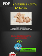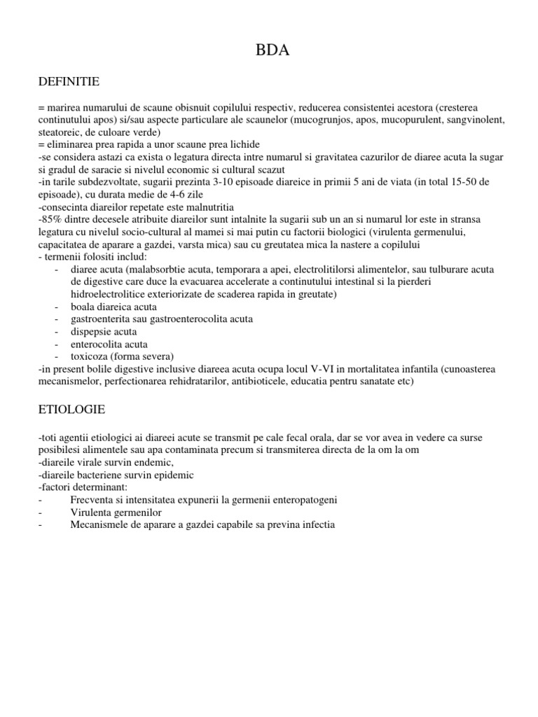 Mecanismul diareei prin aderenta -in mod classic ECEP adera de suprafata mucoasei intestinale producand disolutia glicocalixului si aplatizarea vilozitatilor -aceasta aderenta afecteaza marginea in perie a enterocitului si scade capacitatea de absorbtie efectiva a acestei suprafete Mecanismul diareei parazitare Giardia lambdia: - Actioneaza ca o membrane mecanica impiedicand absorbtia - Produce injurie directa la nivelul mucoasei careia ii accelereaza turnoverul - Elibereaza exotoxine parazitare - Determina o reactie imunologica impotriva gazdei - Altereaza tiparul normal al motilitatii intestinale Mecanismul diareei virale Rotavirusul: - Invadeaza epiteliul vilozitatilor mucoasei intestinului subtire dupa o incubatie de 48-72 de ore - Invazia virala este asociata cu scaderea numarului de cellule de absorbtie avand ca effect un raspuns proliferativ in cripte, de unde se initiaza repopularea marginii epiteliale cu cellule nediferentiate care au fost invadate de virus - Aceasta inlocuire a celulelor epiteliale vilozitare cu cellule care isi au originea in cripte are ca effect scaderea activitatii dizaharidelor ceea ce conduce la afectarea predominant a jejunului, dar daca leziunile sunt foarte extinse, vor fi afectate sever functia de absorbtie intestinala si activitatea dizaharidazelor intestinale situate la nivelul marginii in perie, rezultand diaree severa. - Rotavirusul se intalneste cu maximum de frecventa intre 4 si 24 de luni si este neobisnuit la nou nascut care este capabil sa excrete virusul fara sa prezinte semen clinice -sub actiunea germenilor enteropatogeni se constata accelerarea peristaltismului intestinal (rolul fav al PG) care limiteaza absorbtia apei si electrolitilor din lumen si permite grabirea tranzitului -este interferata atat capacitatea de absorbtie a intestinului cat si activitatea de transport cellular active pentru apa si sodium -creste secretia activa de sodium si apa in lumen care alaturi de accelerarea peristaltismului conduce la aparitia de scaune mai frecvente si mai lichide -inhibarea absorbtiei de apa si electroliti , la care se adauga cresterea secretiei active, are ca efect limitarea capacitatii de manipulare a apei la nivelul intestinului, cu dezechilibre hidroelectrolitice consecutive, care se soldeaza curand cu SDA care este agravat de dificultatea inlocuirii pierderilor datorita anorexiei si varsaturilor -lichidele pierdute sunt izotonice -este tulburata digestia alimentelor in special digestia lactozei, in diaree scazand activitatea dizaharidazelor intestinale situate la nivelul marginii in perie -in lumen se acumuleaza molecule neabsorbite, osmotic active, care accentueaza pierderile de apa si electroliti (diaree osmotica) -principalele consecinte ale diareii acute sunt deshidratarea si malnutritia -deshidratarea acuta este mai precoce, mai frecventa si mai grava la sugar deoarece acesta are o pierdere insensibila mai mare decat adultul, avand o suprafata corporala mai mare, daca o raportam la greutate. -volumul mai mare al apei extracelulare in comparative cu adultul face ca sugarul sa fie cu mult mai sensibil decat acesta la pierderea de lichide -sugarul are o pierdere fecala de apa mai mare decat la varstele mari, ca raspuns la infectia intestinala, deoarece are un turnover zilnic intestinal mai rapid decat adultul si o sensibilitate crescuta la enterotoxine -riscul de malnutritie legat de diaree tine de incidenta crescuta a recurentelor -fiecare diaree presupune dieta alimentara ceea ce interfera aportul caloric si cresterea -orice infectie digestive creste catabolismul si are un efect negativ asupra absorbtiei