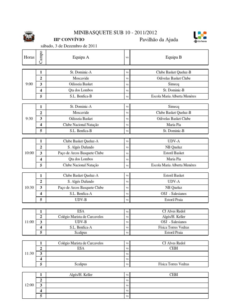St. Dominic-A Moscavide Odisseia Basket Qta dos Lombos S.L. Benfica-B St. Dominic-A Moscavide Odisseia Basket Clube Nacional Natao S.L. Benfica-B Clube Basket Queluz-A S. Algs Dafundo Pao de Arcos Basquete Clube Qta dos Lombos Clube Nacional Natao Clube Basket Queluz-A S. Algs Dafundo Pao de Arcos Basquete Clube S.L. Benfica-A UDV-B ESA Colgio Marista de Carcavelos UDV-B S.L. Benfica-A Scalipus Colgio Marista de Carcavelos ESA