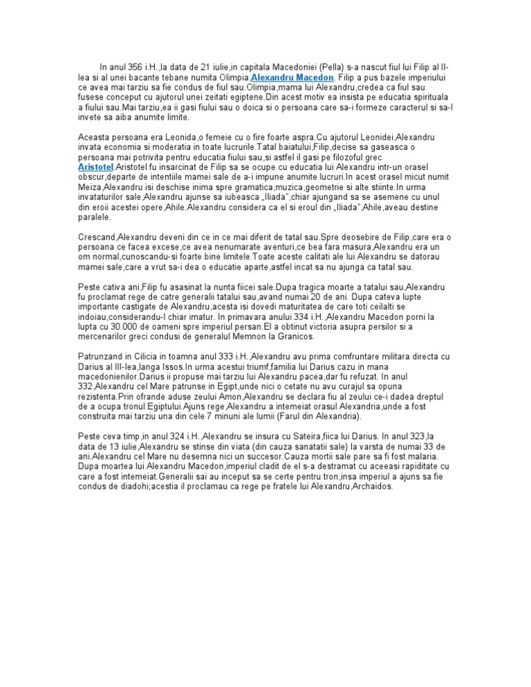,la data de 21 iulie,in capitala Macedoniei (Pella) s-a nascut fiul lui Filip al IIlea si al unei bacante tebane numita Olimpia,Alexandru Macedon. Filip a pus bazele imperiului ce avea mai tarziu sa fie condus de fiul [Link],mama lui Alexandru,credea ca fiul sau fusese conceput cu ajutorul unei zeitati [Link] acest motiv ea insista pe educatia spirituala a fiului [Link] tarziu,ea ii gasi fiului sau o doica si o persoana care sa-i formeze caracterul si sa-l invete sa aiba anumite limite. Aceasta persoana era Leonida,o femeie cu o fire foarte [Link] ajutorul Leonidei,Alexandru invata economia si moderatia in toate [Link] baiatului,Filip,decise sa gaseasca o persoana mai potrivita pentru educatia fiului sau,si astfel il gasi pe filozoful grec [Link] fu insarcinat de Filip sa se ocupe cu educatia lui Alexandru intr-un orasel obscur,departe de intentiile mamei sale de a-i impune anumite [Link] acest orasel micut numit Meiza,Alexandru isi deschise inima spre gramatica,muzica,geometrie si alte [Link] urma invataturilor sale,Alexandru ajunse sa iubeasca Iliada,chiar ajungand sa se asemene cu unul din eroii acestei opere,[Link] considera ca el si eroul din Iliada,Ahile,aveau destine paralele. Crescand,Alexandru deveni din ce in ce mai diferit de tatal [Link] deosebire de Filip,care era o persoana ce facea excese,ce avea nenumarate aventuri,ce bea fara masura,Alexandru era un om normal,cunoscandu-si foarte bine [Link] aceste calitati ale lui Alexandru se datorau mamei sale,care a vrut sa-i dea o educatie aparte,astfel incat sa nu ajunga ca tatal sau. Peste cativa ani,Filip fu asasinat la nunta fiicei [Link] tragica moarte a tatalui sau,Alexandru fu proclamat rege de catre generalii tatalui sau,avand numai 20 de ani. Dupa cateva lupte importante castigate de Alexandru,acesta isi dovedi maturitatea de care toti ceilalti se indoiau,considerandu-l chiar imatur. In primavara anului 334 i.H.,Alexandru Macedon porni la lupta cu 30.000 de oameni spre imperiul [Link] a obtinut victoria asupra persilor si a mercenarilor greci condusi de generalul Memnon la Granicos. Patrunzand in Cilicia in toamna anul 333 i.H.,Alexandru avu prima comfruntare militara directa cu Darius al III-lea,langa [Link] urma acestui triumf,familia lui Darius cazu in mana [Link] ii propuse mai tarziu lui Alexandru pacea,dar fu refuzat. In anul 332,Alexandru cel Mare patrunse in Egipt,unde nici o cetate nu avu curajul sa opuna [Link] ofrande aduse zeului Amon,Alexandru se declara fiu al zeului ce-i dadea dreptul de a ocupa tronul [Link] rege,Alexandru a intemeiat orasul Alexandria,unde a fost construita mai tarziu una din cele 7 minuni ale lumii (Farul din Alexandria). Peste ceva timp,in anul 324 i.H.,Alexandru se insura cu Sateira,fiica lui Darius. In anul 323,la data de 13 iulie,Alexandru se stinse din viata (din cauza sanatatii sale) la varsta de numai 33 de [Link] cel Mare nu desemna nici un [Link] mortii sale pare sa fi fost malaria. Dupa moartea lui Alexandru Macedon,imperiul cladit de el s-a destramat cu aceeasi rapiditate cu care a fost [Link] sai au inceput sa se certe pentru tron,insa imperiul a ajuns sa fie condus de diadohi;acestia il proclamau ca rege pe fratele lui Alexandru,Archaidos.