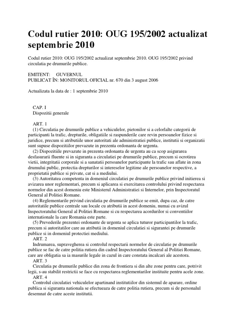 Codul rutier 2010: OUG 195/2002 actualizat septembrie 2010. OUG 195/2002 privind circulatia pe drumurile publice. EMITENT: GUVERNUL PUBLICAT N: MONITORUL OFICIAL nr. 670 din 3 august 2006 Actualizata la data de : 1 septembrie 2010