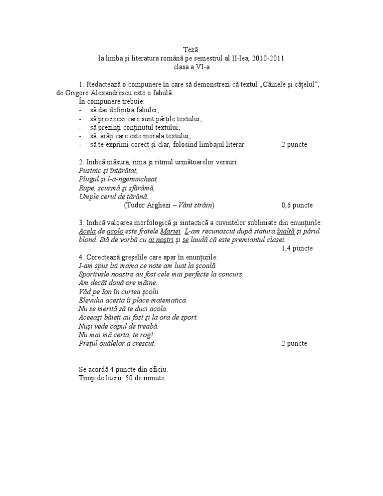 Tez la limba i literatura romn pe semestrul al II-lea, 2010-2011 clasa a VI-a 1.