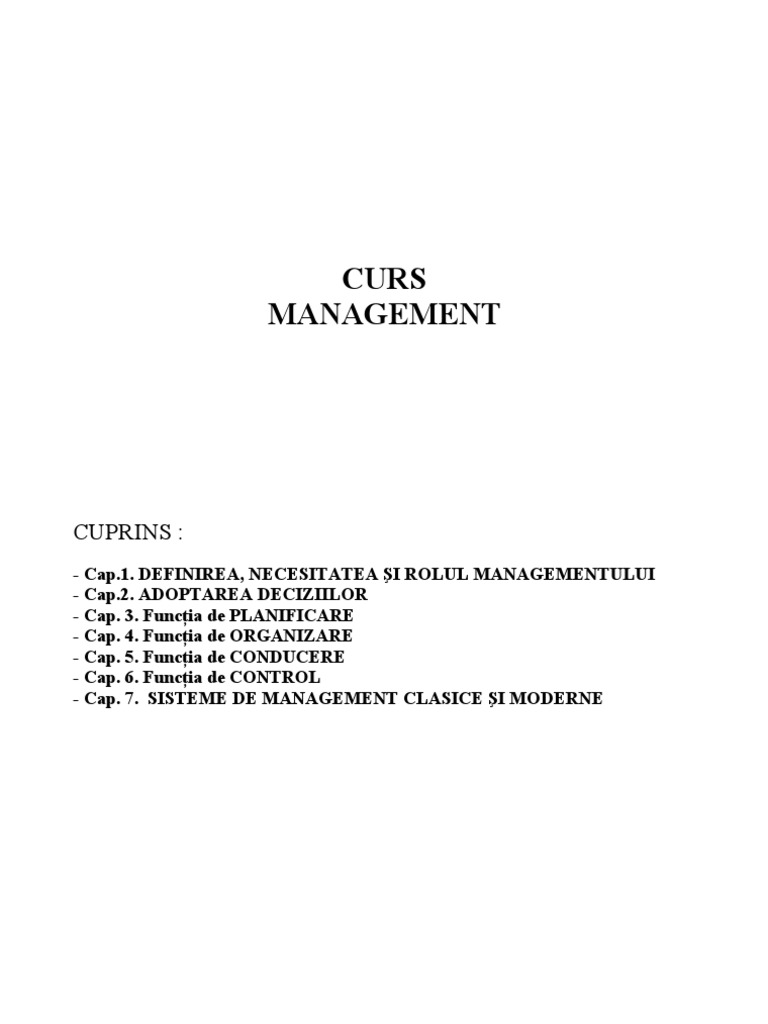 - Cap.1. DEFINIREA, NECESITATEA I ROLUL MANAGEMENTULUI - Cap.2. ADOPTAREA DECIZIILOR - Cap. 3. Funcia de PLANIFICARE - Cap. 4. Funcia de ORGANIZARE - Cap. 5. Funcia de CONDUCERE - Cap. 6. Funcia de CONTROL - Cap. 7. SISTEME DE MANAGEMENT CLASICE I MODERNE
