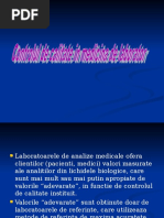 in dublu; intocmirea hartilor de control; utilizarea materialelor de referinta; repetarea probelor pe contraprobe; mentenanta echipamentelor; efectuarea auditurilor interne si instruirea interna a personalului. Un exemplu de harta de control este fisa de control Shewhart, acesta este un grafic de valori ale unei caracteristici date. Linia centrala este reprezentata de valoarea de referinta a caracteristicii urmarite. Pe de o parte si de cealalta a liniei se afla la aceeasi distanta limitele de control. Acele limite indica faptul ca aproximativ 99,7% din valorile obtinute sunt cuprinse in interiorul limitelor si astfel rezultatele obtinute sunt sub control, existand posibilitatea unei erori la un interval de 3 la mie. Asa cum am mentionat si mai devreme exista si un control extern al calitatii, si una dintre cele mai bune cai pentru ca un laborator analitic sa-si monitorizeze performantele atat fata de cerintele proprii, cat si fata de normele altor laboratoare este de a participa regulat la teste de compententa. Aceste participari ajuta nu doar la evidentierea performantelor privind repetabilitatea, ci si reproductibilitatea dintre laboratoare si chiar a eventualelor erori sistematice. In concluzie acest articol vine atat in sprijinul specialistilor din laboratoarele pentru controlul calitatii implicate in asigurarea calitatii si in aplicarea programelor de control al calitatii cat si oricarei persoane interesate de un model de asigurare a calitatii pentru un laborator de control al alimentelor, prin evidentierea acelor aspecte particulare unui astfel de laborator. Vine in intampinare cu pasii necesari pentru asigurarea si controlul calitatii conform standardelor in vigoare precum si principiile de baza pe care un astfel de laborator trebuie sa le urmareasca si sa le indeplineasca pentru a obtine rezultate valide si de performanta.